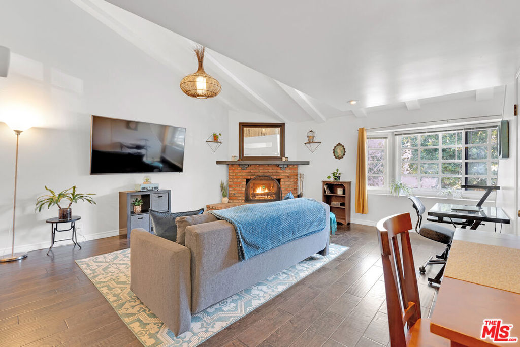 Charming, stylish, and packed with personality, this updated studio condo in a boutique 8-unit building is the ultimate first-place-to-call-your-own. Vaulted ceilings with exposed beams and a cozy brick gas fireplace bring major character while keeping the space bright and inviting. Movie nights are covered with the included 50″ mounted TV, and mornings are easy at the breakfast bar. A spacious bonus loft adds serious versatility, perfect for a home office, guest hangout, or creative zone. Modern upgrades include quartz countertops and in-unit laundry, plus a huge win: *two rare side-by-side parking spaces in a secure, gated garage. Two private storage cabinets make city living even easier. The building offers secure entry, intercom, cameras, locked mailboxes, and guest parking. HOA dues cover water, trash, sewer, *earthquake insurance, landscaping, and professional management. Prime location near the 101 and 170 freeways, with Gelson’s, Starbucks, and local favorites just a short walk away. A true hidden gem and an ideal launchpad into homeownership.