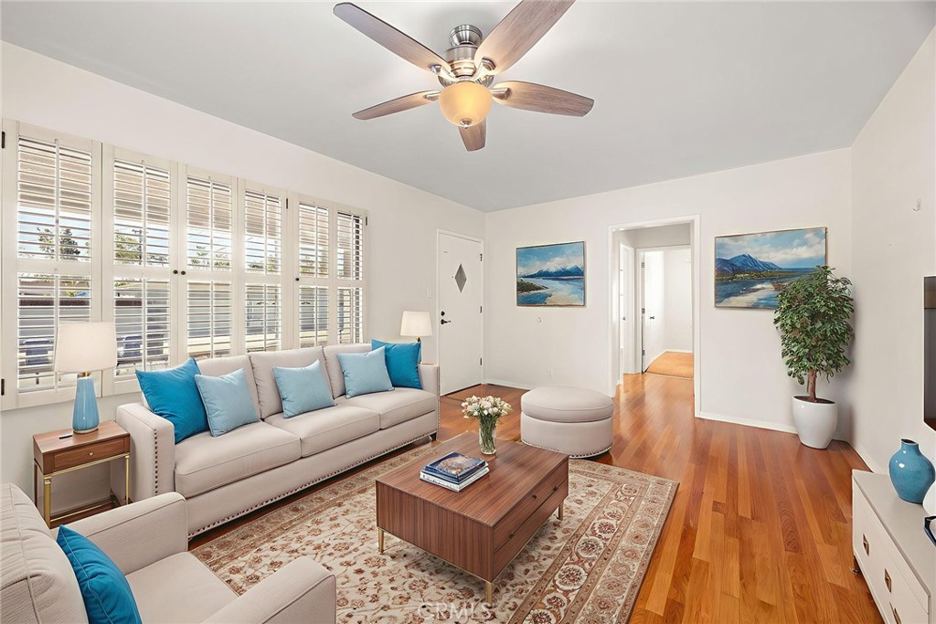 *** Here’s an opportunity for your dream to become a reality ***This charming home can be yours in time for you to enjoy with friends and family for the holidays! The front entrance features a red brick façade and a wrought iron railing leading to a covered entry, creating a warm and timeless curb design. Spacious and bright living room with gleaming hardwood floors and plantation shutters. Living room opens directly to the formal dining area, making family meals and gatherings a breeze with the kitchen just steps away for added convenience. The kitchen with light gray cabinetry is accented by sleek silver hardware. Corian countertops with white appliances, including a stove, microwave, dishwasher, and a large window over the sink brings in natural light. Inside laundry room with built-in storage and direct access to the backyard. Flexible living space with a charming brick fireplace and built-in shelving, offering endless possibilities from a relaxing den to a cozy family room, home office, or 4th bedroom. It has a sliding glass door that opens directly to the backyard, creating an easy indoor-outdoor flow. First and second bedroom located at the front with hardwood floor, and hallway bathroom features both a relaxing soaking tub and a separate glass-enclosed walk-in shower. Third bedroom at the rear of the home is a spacious private master ensuite offering comfort and versatility. Ensuite has a bathroom with a tiled walk-in shower, ample oak cabinetry, and a wide vanity with bright overhead lighting. Ideal as a luxurious retreat or a comfortable mother-in-law suite. It has a sliding glass door and private ramp leading to the covered patio/backyard. The backyard offers a low maintenance outdoor space with mature landscaping, decorative brick-trimmed walkways, flexibility for entertaining, gardening, or creating your own retreat. This home has been virtually staged to illustrate its potential. Live comfortably in this wonderful neighborhood and is conveniently located close to Lakewood mall, shopping, dining, entertainment, great schools, parks, major transit, golf, the LB Airport, and easy access to freeways, don’t miss your opportunity to own this excellent home in the heart of Lakewood.