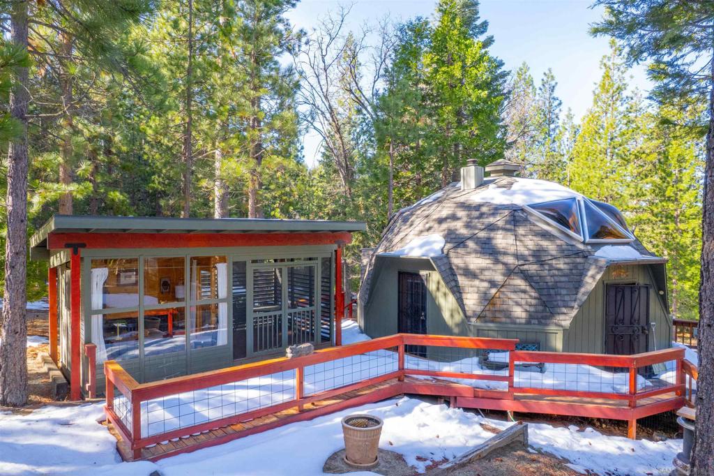 Secluded 1.80 acre Mountain Retreat in Pine Wood Discover a truly unique off-grid sanctuary nestled on 1.80 private acres in Pine Wood, just outside Idyllwild. This one-of-a-kind property features five separate structures, offering flexibility, privacy, and endless possibilities. The centerpiece is a spacious dome home with a spiral staircase leading to a loft for sleeping or storage, abundant skylights, a wood-burning stove, and a wall-mounted heater for year-round comfort. A small but functional kitchen and full bathroom complete the space. Additional structures include a separate guest house with a half bath and screened-in porch, a personal sauna, and a dedicated office with a screened-in deck, seamlessly connected to the home’s wraparound wood deck. A storage shed with solar panels provides extra functionality. Surrounded by towering trees and abundant wildlife, this peaceful retreat offers well, septic, and propane, ensuring self-sufficient living in a serene, natural setting. Experience the ultimate mountain getaway while being just minutes from Idyllwild’s charming shops, restaurants, and art scene.