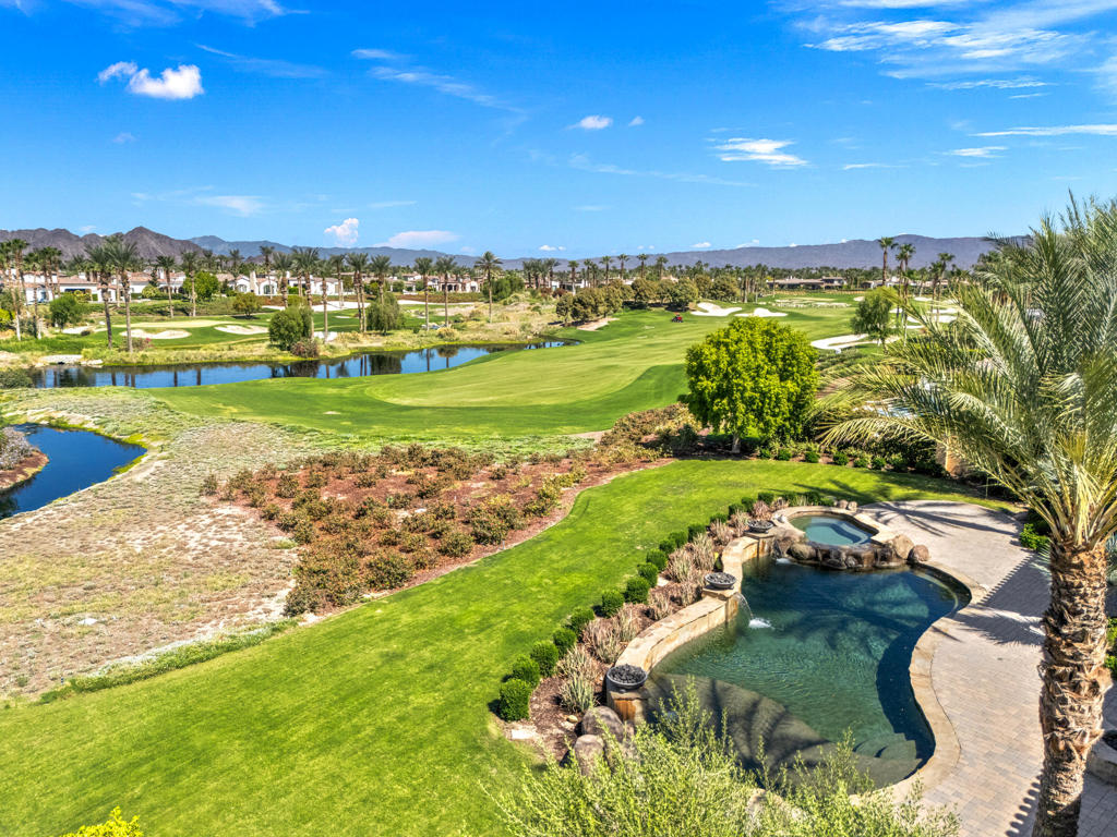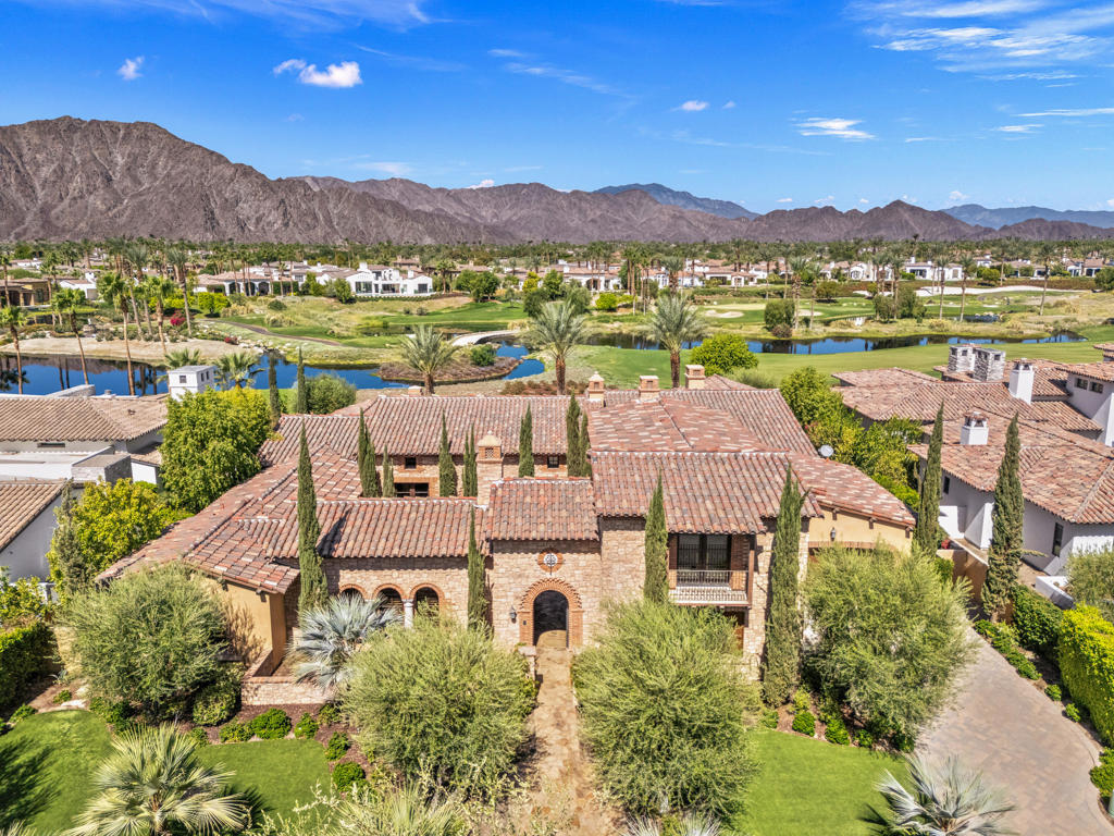 Stunning custom home at the newly renovated Hideaway Golf Club in La Quinta! Location, location, location! Five Bedrooms (5th bedroom is currently a home theater), five bathrooms plus powder room including one bedroom casita with living room with fireplace. Approx. 6,395 sq. ft. on an approx. 1/2 acre lot. Enter through courtyard with custom fountain. Great room with oversized custom fireplace, and gourmet kitchen with center island / bar and wine cellar/tasting room and lovely dining area. Oversized bedroom suite with it’s own patio featuring a fireplace overlooking the courtyard. Luxurious primary suite with fireplace, complete this stately home. Top quality throughout, with all the right amenities. Pocket doors lead to grand loggia with BBQ kitchen, fire pit, custom pool with raised spa and bowls of fire for dramatic entertaining! Attention to every detail with the most desirable materials used throughout. Amazing panoramic west lake & mountain views on the17th fairway of the Clive Clark course! (New photos to come following re-seeding of golf courses).