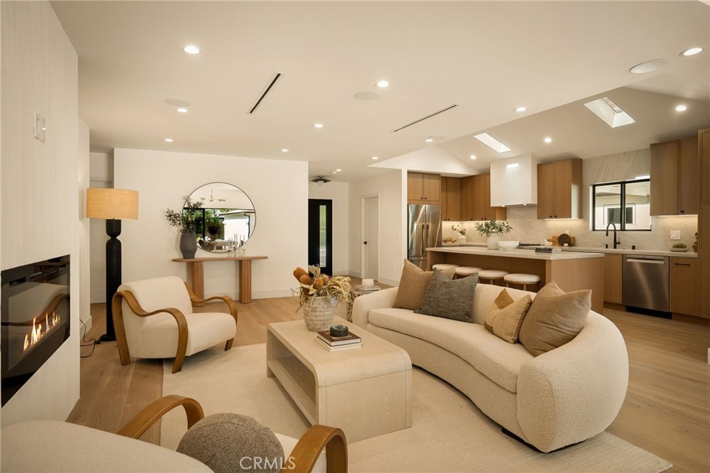 This beautifully reimagined home sits gracefully on a quiet street in one of Valley Village’s most desirable neighborhoods. Thoughtfully redesigned from top to bottom, the 3-bedroom, 2.5-bath residence showcases sophisticated design, natural light, and seamless flow throughout its open-concept layout. The inviting living room, anchored by a cozy fireplace, connects effortlessly to the dining area and a chef’s kitchen featuring a large island, custom White Oak cabinetry, Taj Mahal quartzite countertops, and premium appliances — the perfect setup for gatherings and everyday living. Sliding doors open to a spacious entertainer’s backyard featuring a brand-new pool and spa, surrounded by lush greenery and ambient landscape lighting that create a private, resort-like retreat. The primary suite offers direct access to the backyard and a spa-inspired bath with a freestanding soaking tub. Each bedroom is spacious and filled with natural light, offering comfort and versatility for family, guests, or creative use. The home also features a dedicated laundry room with ample storage, carport parking, and a detached 1-bedroom ADU showcasing high ceilings and abundant natural light.. The property’s extended driveway provides generous parking for several vehicles, including space for an RV. Set on an expansive 8,100 sq. ft. lot, this 2,600 sq. ft. property blends modern luxury with timeless warmth, offering exceptional design and functionality in one of Valley Village’s most desirable neighborhoods — just moments from a House of Worship.