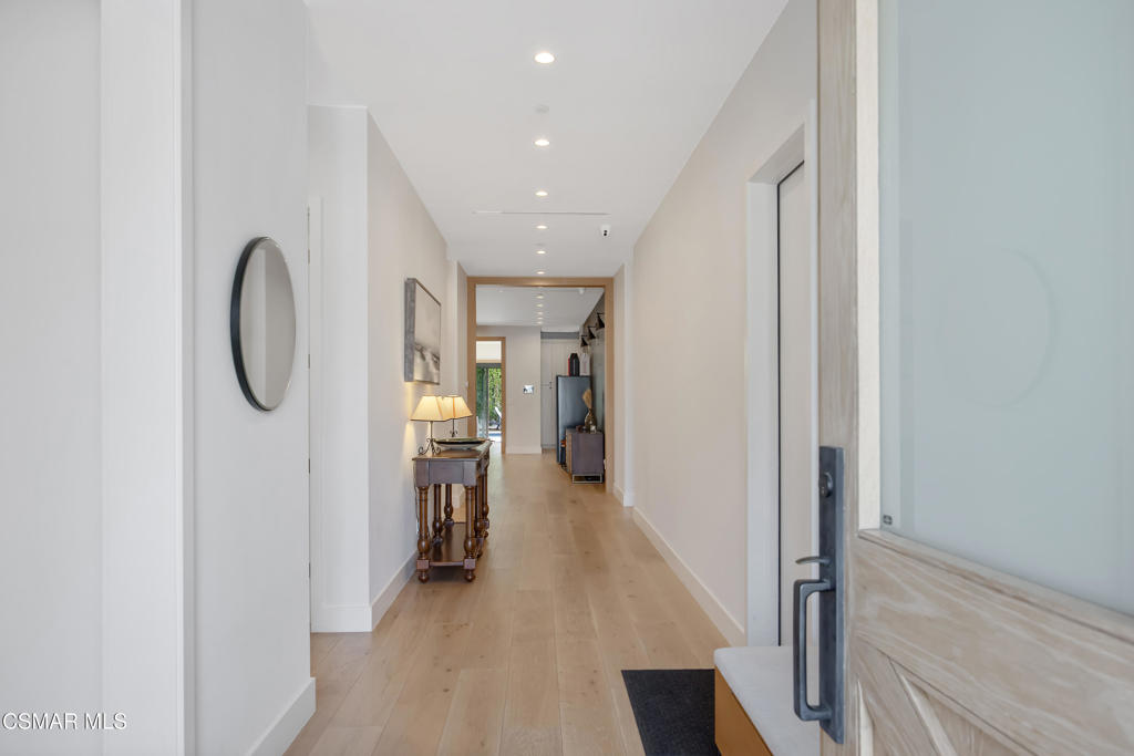 Welcome to 5444 Murietta Avenue, a stunning single-story residence in the coveted Chandler Estates neighborhood of Sherman Oaks. Newly constructed in 2022, this contemporary masterpiece blends luxury, comfort, and modern technology across more than 3,100 square feet of thoughtfully designed living space. With 4 bedrooms, an office, and 4.5 bathrooms, every detail has been carefully curated for today’s lifestyle.Step through the oversized front door and you are immediately drawn into the expansive great room floorplan, where soaring ceilings with wood beams, designer finishes, and abundant natural light create a warm yet sophisticated ambiance. The living room showcases a dramatic fireplace, custom built-ins, and a disappearing sliding glass wall system that seamlessly connects the indoors with the private backyard oasis. Adjacent, the formal dining area is accented by rich brick details and offers the perfect setting for memorable gatherings.At the heart of the home is a chef’s dream kitchen. Outfitted with a large walk-in pantry, custom cabinetry, and top-of-the-line stainless steel appliances, this space is both functional and stylish. Highlights include a six-burner gas cooktop with flat griddle, dual ovens, built-in microwave, built-in refrigerator, and two sinks for added convenience. The expansive center island, finished with striking waterfall counters and bar seating, invites casual dining and effortless entertaining.The private primary suite is a sanctuary of comfort. Vaulted ceilings, a cozy fireplace, and another sliding glass wall bring elegance and openness to the space, while dual custom walk-in closets provide generous storage. The spa-like primary bath features dual vanities, a dedicated makeup area, a soaking tub, and a glass-enclosed shower with both rain shower head and handheld spray.Three additional guest bedrooms each enjoy high ceilings with exposed wood beams, en-suite bathrooms, and custom closet systems, ensuring comfort and privacy for family and guests alike. The dedicated office includes built-in cabinetry, offering the ideal environment for work or study.The resort-style backyard is designed for year-round enjoyment. Relax by the sparkling pool and spa with a baja shelf and cascading waterfall feature, or entertain at the covered gazebo with lighting, built-in BBQ, and bar seating. Artificial turf ensures low-maintenance beauty, while mature landscaping enhances privacy.This smart home is fully equipped with surround sound speakers, a Control4 home automation system, and a comprehensive security setup with alarm and cameras. Additional highlights include a large laundry room with sink and cabinetry, a tankless water heater, a direct-access two-car garage with epoxy floors and storage, and a beautifully landscaped front yard with artificial turf and contemporary brick accents.5444 Murietta Avenue represents the best of modern Southern California living–sophisticated design, seamless indoor-outdoor flow, and luxurious amenities, all in one of Sherman Oaks’ most desirable locations.