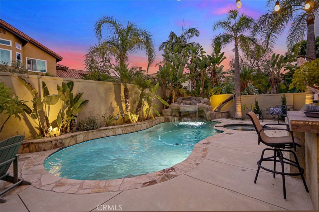Your Gorgeous Tropical Backyard Oasis Awaits! Beautifully Updated 4-Bedroom + Office/Library and 3-Bathroom Home on a Small Cul-De-Sac Street Features a Stunning Entertainer’s Backyard with Sparkling Salt Water Pebbletec Pool & Spa with Waterfall & Grotto, Custom-Built BBQ Island with Bar Top Seating & Grill, Low-Maintenance Artificial Turf, Flagstone Decking, Fire Pit and Fruit Trees, All Surrounded by Lush Tropical Landscaping – Approx 2,700+ SqFt Concerto Floorplan has a Convenient Main Floor Office/Library & Bathroom with Shower – Freshly Painted Exterior & Stamped Concrete Walkways Create a Warm & Inviting Curb Appeal – Handsome Wood Laminate Flooring Throughout the Main Level – Formal Living & Dining Rooms have High Vaulted Ceiling & Elegant Plantation Shutters – Large Chef’s Kitchen Offers Ample Two-Toned Cabinetry, Silestone Countertops, Center Island, Walk-In Pantry & Breakfast Eating Nook – Kitchen Open to Family Great Room with Stylish Glass Tile Fireplace – Double Door Entry to Primary Suite with Walk-In Closet, Romantic Dual-Sided Fireplace & Private Balcony Deck with Scenic Views of Hills & Trees – Primary Bathroom has Faux-Wood Tile Flooring, New Recessed Lighting, Dual Vanities, Soaking Tub & Separate Shower – Also Upstairs are 3 Additional Bedrooms (one has a walk-in closet) and Full Hall Bathroom with Dual Sinks – Inside Laundry Room with Sink & Door to the Side Yard – Newer HVAC System (AC & Furnace) – Attached 3-Car Garage with Newer Garage Doors & Additional Parking Space in Wide Driveway – No HOA Dues – No Mello Roos Tax – Award-Winning Placentia-Yorba Linda School District, Zoned for Bryant Ranch Elementary, Travis Ranch Middle & Yorba Linda High – Easy Access to the 91 Freeway & 241 Toll Road – Also Close to Brush Canyon Park with Lighted Basketball Court, Tennis Courts, Picnic Shelter, Playground & New Pickleball Courts!