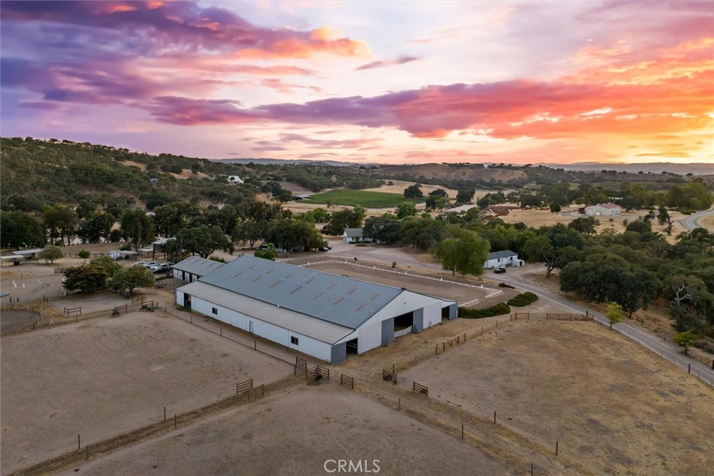 Welcome to Moon Valley Farm — a rare 20-acre riverfront equestrian estate, formerly known as the Clyde Kennedy Center, offering the ultimate blend of privacy, functionality, and breathtaking scenery. This one-of-a-kind property is perfectly designed for both horse enthusiasts and those seeking a serene country lifestyle, while still being just minutes from town. The centerpiece is a 12-stall Barnmaster barn complete with matted stalls, a spacious 30’ x 16’ tack room, foaling stall, washer/dryer, storage rooms with an upstairs loft, and full utilities including water and power. Amenities abound with a 70’ x 140’ indoor arena with sprinklers and lighting—perfect for year-round training or events—and a 100’ x 200’ outdoor arena. Seven pastures (two irrigated) and eight additional corrals provide ample turnout space with horse-safe fencing, many with shelters. The custom main home, built in 2001, spans approximately 2750 sq ft per with 3 bedrooms plus an office (potential 4th bedroom) and 3 bathrooms. Highlights include cathedral ceilings in the entry and living room, 9-foot ceilings throughout, a floor-to-ceiling river rock wood-burning fireplace, a split red cedar ceiling at the covered front porch, granite countertops, and French doors leading to a deck with sweeping Huer Huero River views. Owned solar (2019), an extra-deep two-car garage, and thoughtful finishes throughout complete this inviting residence. For guests or a workers residence, a charming 500± sq ft studio offers a full kitchen and bath plus an exterior half bath for boarders. A 1987 manufactured home adds even more flexibility with 3 bedrooms, 2 baths, a bonus room and separate metering at both accessory homes. Enjoy the land’s unique features: direct riverbed access for riding, a seasonal pond, windmill, irrigated pastures, garden box, and mature oak, apricot and pistachio trees. With a hay barn, large shop with roll-up doors, 220 power, the 75 GPM ag well plus a domestic well, this property is set up for both comfort and convenience. Whether you’re envisioning a thriving equestrian business, a private retreat, or both—this stunning property offers endless possibilities in a truly magical setting. Don’t miss the chance to make Moon Valley Farm your own.