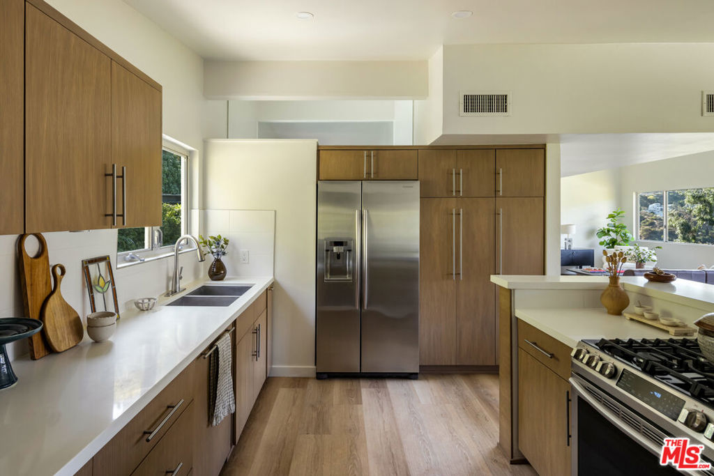 Perched high in the Los Feliz Oaks, 5661 Spreading Oak Drive is a beautifully reimagined 3-bedroom, 2-bathroom retreat with unobstructed views of the iconic Hollywood Sign and surrounding Hollywood Hills – an awe-inspiring backdrop from nearly every angle. Just minutes from Griffith Observatory and the scenic trails of Griffith Park, this home effortlessly blends mid-century charm with modern luxury. Recently remodeled throughout, it features brand new flooring, designer finishes, and a resurfaced gourmet kitchen with sleek countertops and custom cabinetry. The sunlit, open-concept living and dining area is ideal for entertaining or relaxing in style. The spacious primary suite offers a peaceful retreat with views of lush greenery, while two additional bedrooms provide flexibility for guests, a home office, or creative space. Step outside to the newly finished terraced deck – perfect for al fresco dining, morning coffee, or gatherings under the stars. A rare find in the Hills, the home also boasts a generous two-car garage, an invaluable amenity in this exclusive neighborhood. Tucked away on a quiet, tree-lined street yet close to Los Feliz Village, Hollywood, and major studios, this turn-key home offers the ultimate in privacy, location, and classic LA living.