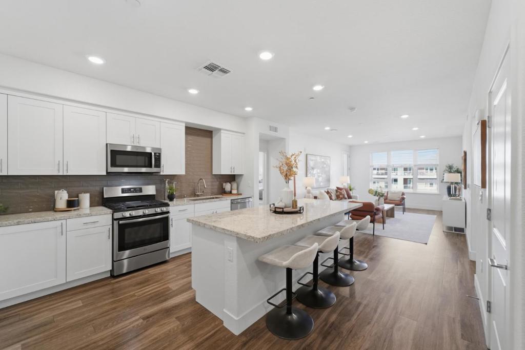 Welcome to 5933 Sunstone Dr #410, a modern luxury condo with 2 bedrooms plus a den in the desirable Avenue One community. Built in 2019 and still feeling like new, this spacious ~1,306 sq ft home offers convenient single-level living with no stairs. The bright open floor plan features two private suites plus a versatile den perfect for a home office or guest room. The stylish white kitchen includes quartz countertops, a large island with a breakfast bar, soft-close cabinets, and stainless steel appliances with a gas stove. The primary suite offers a large walk-in closet and a spacious bathroom with a dual vanity and walk-in shower. Additional highlights include elevator service, and two assigned underground parking spaces. Residents enjoy resort-style amenities including a luxury clubhouse, pool, spa, gym, yoga room, BBQ areas, playground, and community gardens. Conveniently located near parks, shopping, dining, and with easy access to Hwy 85, Hwy 101, and VTA Light Rail.