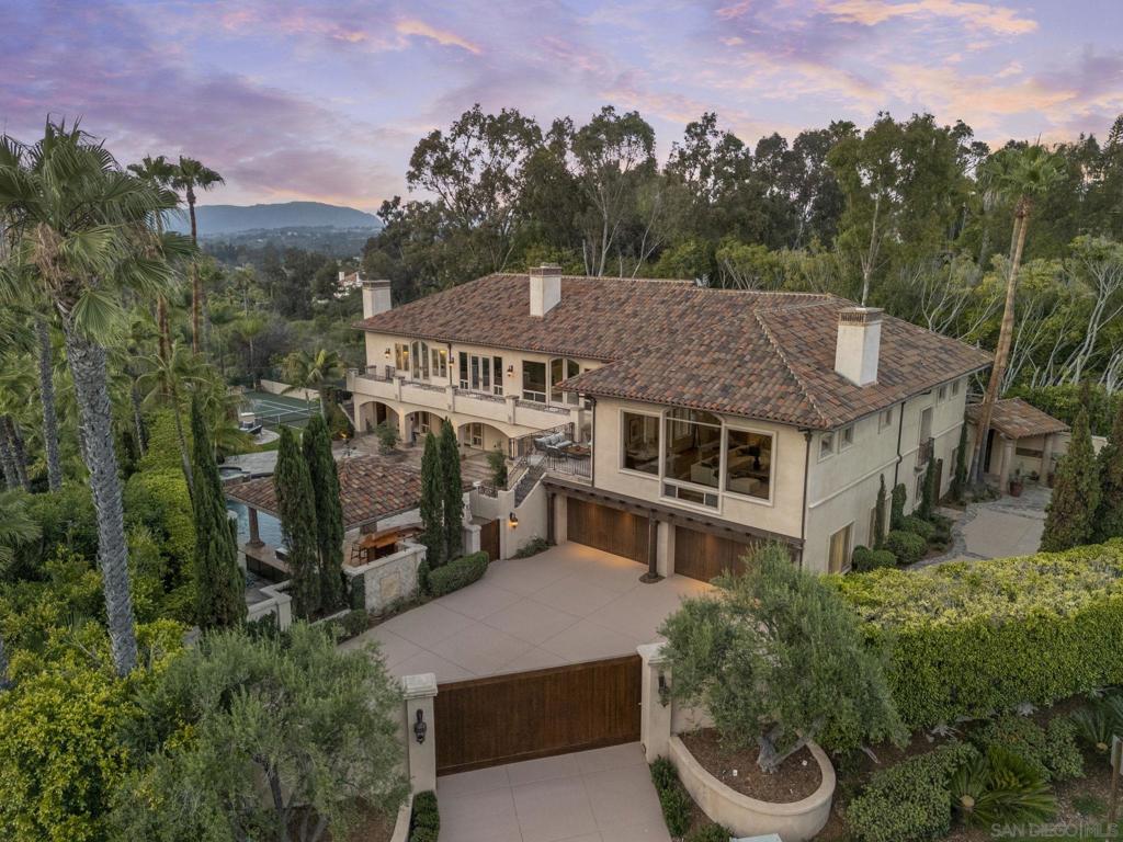 Best VALUE in 92067!!! Away from the madding crowd, offering the Best of Ranch & Coast Luxury Living! Behind private motor gates, recently renovated 8,500+ SF estate lives like a true single-level retreat, offering elevated luxury, privacy & cinematic VIEWS stretching past the Del Mar Fairgrounds to the OCEAN & distant mountains. Just minutes from the Del Mar Racetrack, Rancho Valencia Resort & Spa, and Southern California’s iconic beaches. Thoughtfully designed floor plan feat 6+ BRs, 4-CAR garage, private elevator & seamless indoor/outdoor living. Highlights include formal dining with honed stone floors, a mahogany executive office with fireplace, a serene wellness suite with Massage area & Cedar Sauna, and a Great Room with steel-framed floor-to-ceiling windows, wet bar & distressed pecan hickory floors. Gourmet kitchen is appointed with Taj Mahal countertops, custom cabinetry, double ovens, dual dishwashers, pot filler, warming drawer, skylights, and walk-in pantry. Expansive primary suite offers a true spa bath w/ soaking tub, oversized glass shower & dual vanities plus a dramatic two-story custom closet with boutique-style cabinetry and closet island. Smart home systems include Lutron, DoorBird, Nest, Pentair & more. Add’l amenities: 98” 4K media room, 1,180-bottle wine cellar w/ tasting lounge, full gym, and spacious guest suites. Outdoors: tennis court, family BBQ area w/ fireplace, grassy play lawn, private pool & jetted spa, and fully equipped outdoor kitchen w/ ceiling heaters, fridge, BBQ, stove, prep sink & bar.