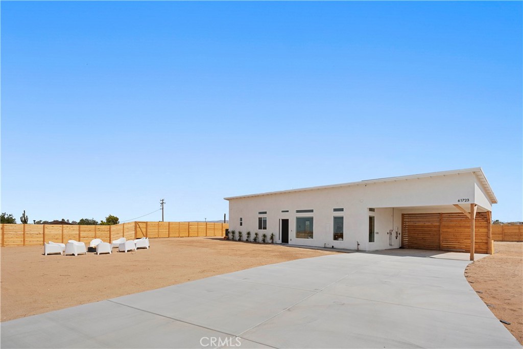 Architect-designed contemporary residence built in 2024, with custom detail throughout. The home features 10-foot ceilings, expansive windows, skylights, and an open floor plan. Interior living space totals 1,043 sq ft, complemented by a California room offering over 110 sq ft of indoor/outdoor dining and living space with an electric fireplace. Set on 2.5 acres, the property provides a rare sense of openness, with approximately one-third enclosed by 6-foot-high fencing for privacy. An automatic gate opens to a concrete driveway leading to an attached carport. Interior finishes include recessed lighting, linear air distribution, and a custom entertainment wall with floating shelving. The kitchen is designed for both function and aesthetics, featuring new stainless steel appliances, a 12-foot peninsula with breakfast bar seating, custom cabinetry extending to the ceiling, open shelving, a vent hood, and tiled accent walls. The home offers generously sized bathrooms with a modern aesthetic, including tile extending to the ceiling and 8-foot glass shower enclosures. The primary suite includes a large private bath with a round soaking tub, glass-enclosed shower with black wall-mounted shower fixtures, ceiling-height tile, and a dual-basin vanity. Bedrooms feature large windows with privacy shades. Additional amenities include a photovoltaic solar system with 15 panels and a Tesla battery capable of powering the home during electrical outages. Exterior features include a concrete patio, an in-ground stock tank pool with a full filtration system discreetly housed beneath a custom wooden bench, and an outdoor rain-style shower. Located in the Hidden River neighborhood, known for architecturally distinctive homes, with convenient access to restaurants, cafés, the farmers market, and Joshua Tree National Park. Property is partially occupied. Please do not disturb occupants.