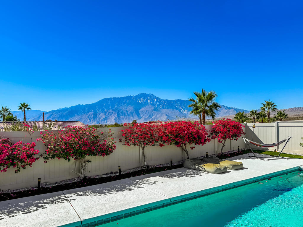 SPECTACULAR MOUNTAIN VIEWS and COMPLETE PRIVACY — this stunning Mountain View Country Estates home offers a true desert lifestyle experience, with breathtaking western vistas from the great room, primary suite, and backyard retreat. The expansive entertainer’s yard feels like your own private resort, featuring a sparkling pool and spa, raised viewing deck for sunset cocktails, covered patio with outdoor TV area, a lush sitting space beneath grapevine-covered trellises, and a tranquil Zen garden with a soothing fountain. Every corner of this outdoor paradise is completely private — even the upper deck — making it ideal for those who value peace, relaxation, or a refreshing dip in total seclusion. Inside, the home has been stylishly remodeled with a reimagined open-concept design that brings in light, space, and flow. The great room features a dramatic floor-to-ceiling tiled fireplace and a wall of glass sliders framing the pool and mountain backdrop. Luxury vinyl plank flooring flows seamlessly throughout, creating a warm and modern atmosphere with the look of natural wood and the durability of today’s best materials. The chef’s kitchen is a showpiece, showcasing waterfall-edge Quartz countertops, breakfast bar seating, upgraded stainless steel appliances, vent hood over a six-burner gas range, farmhouse-style sink, wine fridge, and elegant cabinetry. The flexible floor plan offers four bedrooms, including a private casita-style suite currently used as a media room and guest quarters with its own bath. The expansive primary suite features direct access to the spa and pool, with panoramic mountain views. Its luxurious ensuite bath includes a freestanding soaking tub, oversized shower, dual vanities, extensive cabinetry, and custom tile work. Additional highlights include a guest bedroom, convertible den, modern ceiling fans, recessed lighting, indoor laundry, and direct access to a two-car garage plus RV parking with hookups. Located in the ”Family Section” of the gated Mountain View community, residents enjoy a community pool and spa, as well as nearby access to Mission Lakes Country Club for golf, dining, and recreation. Outdoor enthusiasts will love the Windy Ridge Trail just outside the community entrance.