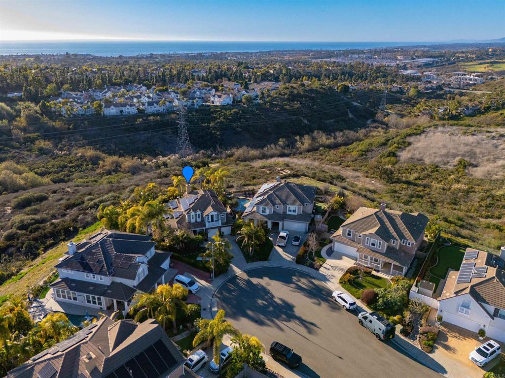 This stunning property at 6497 Wayfinders Ct. in Carlsbad CA is located in the small enclave of Surfpoint Fine Homes (same builder as Bay Collection), truly stands out with its luxurious and thoughtful design, making it an entertainer’s dream and a haven for comfortable living. One of the standout highlights is the primary suite conveniently located on the first floor (two story that lives like a single story), offering easy access and privacy, complete with elegant marble counters in the primary bath for that spa-like feel. The heart of the home is an open kitchen and family room, boasting high-end Thermador appliances, marble counters, and a custom-built kitchen banquette that’s perfect for casual meals or gatherings. Adding to the sophistication are Hunter Douglas PowerView shades for effortless light control. The backyard is a true tropical oasis, transformed with more than 50 palm trees that create a lush, resort-style escape. It features a thermal panel-heated Pentair-controlled pool and spa, custom lighting, a built-in bar with a new Lion built-in grill for seamless outdoor cooking, and a putting green for fun leisure activities. The custom-built palapa provides shaded seating, and the crescent-shaped layout ensures ultimate privacy while framing breathtaking ocean views through protected open space. Imagine hosting evenings here with front-row seats to the Legoland fireworks shows—it’s designed for unforgettable backyard entertaining. Inside, practicality meets luxury with a private office equipped with a temperature- and humidity-controlled custom wine refrigerator that can store up to 522 bottles and 36 magnums, ideal for any wine enthusiast. Sustainability is key too, with fully owned solar panels to keep energy costs low and efficient, plus a Tesla EV wall charger for convenient plug-and-go charging. Situated in a double cul-de-sac within a small, exclusive enclave of just 21 homes, the property offers a serene, private feel without sacrificing modern conveniences.