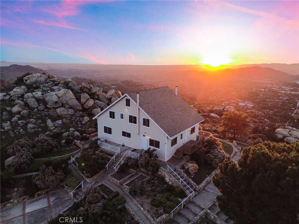 With an eagle-eye view across North San Diego County all the way out to Catalina Island and 360 degrees back along the ridgeline and mountain views, this home tops a prime 40+ acres. Whether the existing hilltop residence is maintained as an exclusive residence or the next owner takes advantage of the A70 zoning just south of Temecula’s wine country, the opportunities are almost as endless as the views. Imagine the events, whether intimate or grand, that could be hosted at each glorious sunset. Nestled at the end of a private road but with convenient access to the 15 freeway, you’ll feel instantly far away from it all while within minutes of all major amenities. Lovingly maintained, this home boasts all new dual pane windows, new carpet, and new paint – all without compromising its rustic charm and any further vision its new owner wants to bring forward. Downstairs features a large living room with large windows facing the panoramic vistas and sunset, two bedrooms, and a large hosting kitchen. Upstairs you’ll find a bonus large family room, a dedicated workspace, and two generous bedrooms that each span the width of the home and in so doing offer two separate sides, one facing the panoramic/ocean view and one facing the mountains, so while linked, they can function as four upstairs bedrooms. And last but not least the attic is finished with carpeted stair access, beautiful shelving, and window ventilation. So many thoughtful details went into the customization of this home that will continue to serve it well, including solar on grid, a Solahart solar water heater, a roof pitch and direction designed to optimize insulation, and a raised foundation with a generous crawlspace. The land, which was maintained using organic farming techniques (no pesticide or compost contaminants), has boasted orchards and vineyards and sits ripe to bloom again, with numerous water lines to all cleared areas of the property. The soil is sandy loam in composition, drains well and is excellent for horticulture. Extensive terracing and stone masonry was cultivated over the years and affords thoughtful outdoor spaces and ample parking. A 24×24 shed below the house boasts a 7’ roll up door and a second 36” door to accommodate a tractor and other equipment. Unparalleled opportunity awaits – it’s time to make your move.