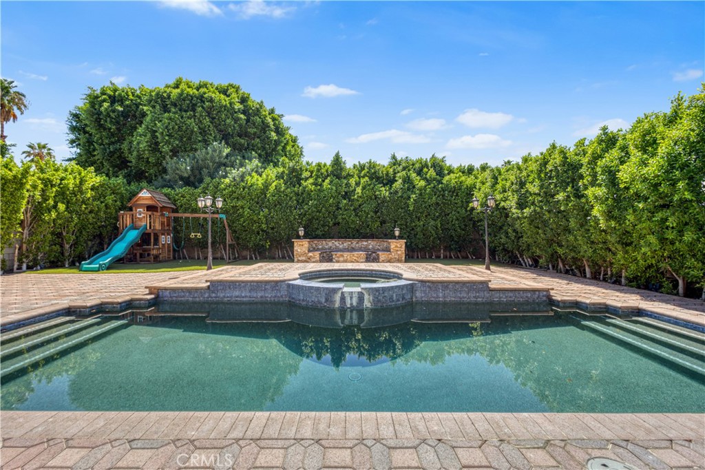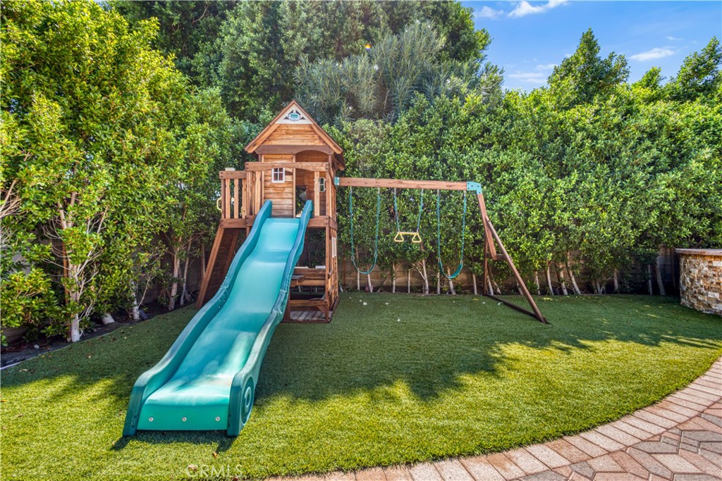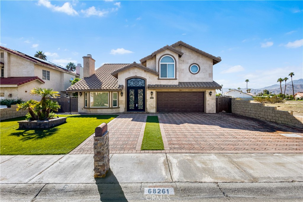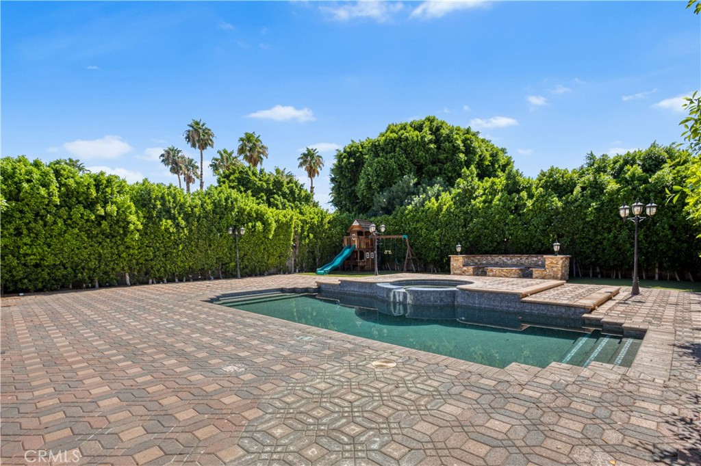 Welcome to your desert oasis, a stunning and fully furnished rental property located in the desirable Cathedral City, just minutes from the heart of Palm Springs. This home is designed for modern comfort and sophisticated living. Step inside to a grand, open-concept living area featuring high vaulted ceilings and beautiful tile flooring that extends throughout the main level. The space is anchored by a striking, floor-to-ceiling tiled fireplace, providing both warmth and a contemporary aesthetic. Relax on the comfortable sectional sofa while enjoying the natural light from the expansive windows. The sleek, gourmet kitchen is a chef’s dream, boasting high-gloss, two-toned cabinetry and Quartz countertops and backsplash. It comes fully equipped with modern, stainless steel appliances, including a spacious refrigerator and a built-in microwave, complemented by elegant red accent pieces. For entertainment, a dedicated game room awaits, complete with a pool table and foosball table, set against a stylish stone accent wall with a built-in fireplace and TV. A convenient sliding glass door provides seamless access to the outdoor living area. Wood flooring adds warmth and elegance to all bedrooms. Each of the three bedrooms features private access to a huge balcony that overlooks the lush backyard and offers a perfect space for morning coffee or evening relaxation. The private backyard is a true retreat. It features a sparkling swimming pool, a relaxing spa, and a separate playground area, all surrounded by lush, mature greenery for ultimate privacy. The outdoor kitchen with a built-in grill is perfect for al fresco dining and entertaining. This property offers an exceptional blend of luxurious indoor living and resort-style outdoor amenities, making it the perfect home base for your extended stay in the Palm Springs area.