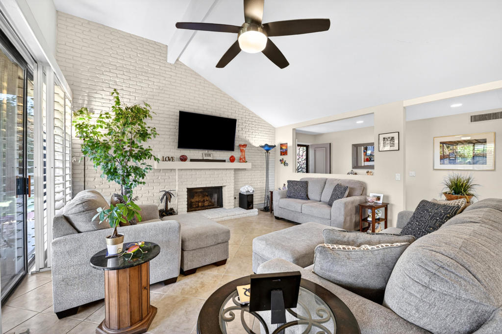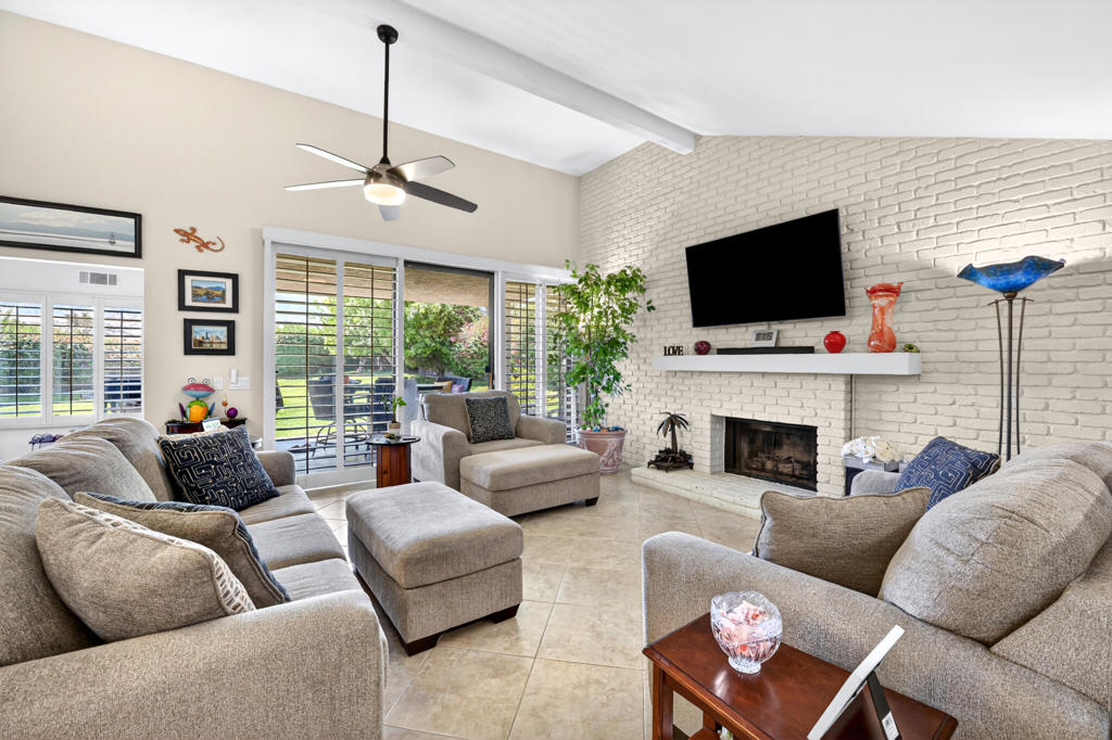 Experience refined desert living in this beautifully maintained residence located within the highly desirable Cathedral Canyon Country Club. Offering 2 bedrooms plus a versatile den, 2 bathrooms, and 1,918 square feet of thoughtfully designed living space, this home is ideally positioned with southwestern exposure capturing unobstructed views of the San Jacinto Mountains–creating the perfect backdrop for true desert living. Step inside to a light-filled interior where soaring vaulted ceilings and an open-concept layout create a warm and inviting atmosphere. The spacious living area centers around a charming fireplace and flows seamlessly into the dining space–ideal for both everyday living and effortless entertaining. Large windows and sliding glass doors frame picturesque outdoor views while bringing in an abundance of natural light. The kitchen is well-appointed with ample cabinetry, generous counter space, and a convenient layout that opens to the main living areas. Just beyond, a cozy breakfast nook and direct access to the patio enhance the home’s indoor-outdoor lifestyle. The expansive primary suite offers a private retreat, complete with dual vanities, a soaking tub, and a separate shower. A well-separated guest bedroom and bath provide comfort and privacy for visitors, complemented by the newly renovated guest bathroom. The den offers flexibility for a home office, media room, or additional guest space. Step outside to a covered patio where the southwestern orientation truly shines, overlooking lush greenbelt and showcasing breathtaking, unobstructed mountain views–perfect for morning coffee, golden hour gatherings, or relaxing under the desert sky. The serene setting provides both privacy and a true sense of tranquility. Additional highlights include a spacious laundry area, ample storage, and an attached 2-car garage. The HOA of $691/month covers the roof, building exterior, landscaping, cable, and internet–offering convenience and peace of mind. The property is situated on leased land with a land lease of $169/month, secured through 2061. Located within the gated Cathedral Canyon Country Club, residents enjoy access to golf, tennis, pools, and a vibrant desert lifestyle just minutes from shopping, dining, and entertainment.