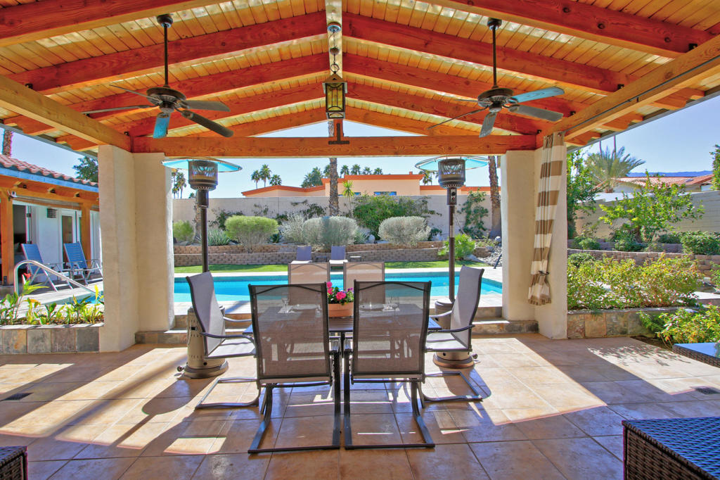 This house has everything you need to relax, entertain and to make it home. Here in the heart of South Palm Desert rests a rustic Southwestern Ranch style home – a generous 2900 square foot retreat on 11,760 square feet of land. It is just minutes away from El Paseo Drive with its many high-end shops and restaurants. This 5BR 4BA home is turn-key furnished. You will love the light interior, featuring exposed beams and wood-planked ceilings throughout most of the home. The heart of the home is the sunny kitchen with its soaring ceilings. There is a casual eating area plus an eat-in bar. Adjacent spaces include a formal dining room for hosting your dinner parties with access to the front yard patio, and the living room with a fireplace which provides a comfortable and warm area to entertain or just to relax. The home is presently has five bedrooms including a large very private master ensuite bedroom which opens directly onto the back patio and pool. There are two additional ensuite bedrooms and two additional smaller rooms that are configured as bedrooms. The large laundry room is centrally located for convenience.The backyard provides a wonderful gathering spot, featuring a pool/spa, outdoor shower, covered patio, with an outdoor kitchen and dining area. Lush landscaping frames the pool with the remaining property landscaped in low-maintenance desert-scape. An oversized two car garage provides loads of storage.
