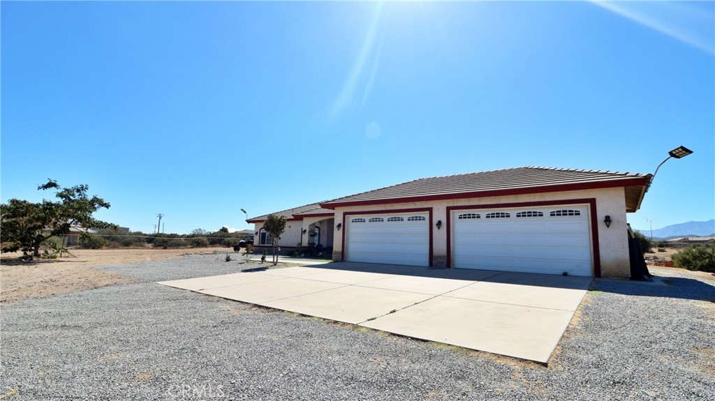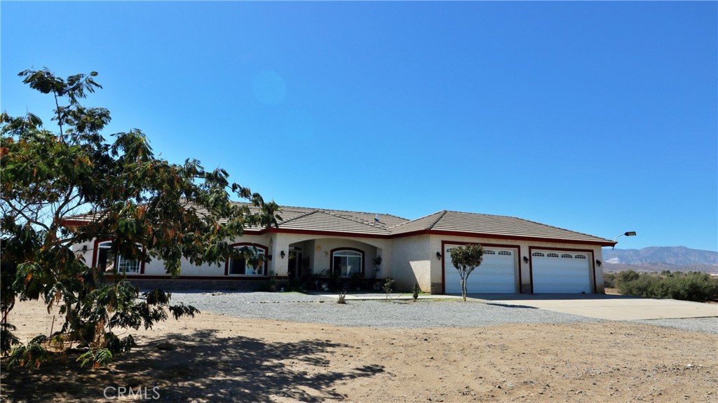 Beautiful Modern Ranch Home with Pool & Mountain Views on 2+ Acres. Welcome to this spacious 5-bedroom, 3-bath single-story home offering 2,462 sq. ft. of living space on over 2 acres of open High Desert land. Built in 2006 with modern style and comfort in mind, this property blends rural privacy with convenient amenities. Step inside to find an inviting open floor plan with high ceilings, tile and wood flooring, and a cozy wood-burning stove that anchors the family room. Large picture windows fill the living spaces with natural light and capture peaceful desert and mountain views. The chef’s kitchen features dark cabinetry, granite countertops, double ovens, and ample counter space—perfect for preparing meals and entertaining guests. A formal dining area sits just off the entry, ideal for family gatherings or dinner parties. The home offers five spacious bedrooms, including a well-appointed primary suite with plenty of natural light and space to relax. Three full bathrooms provide convenience for family and guests alike. Outside, you’ll find room to roam on 2.15 acres, including a private in-ground pool for cooling off on summer days, and a 4-car attached garage providing plenty of space for vehicles, storage, or workshop use. With tile roofing, central heat and A/C, and a modern frame construction, this home is designed for comfort and durability. Enjoy quiet desert living with easy access to nearby highways, shopping, and schools. Whether you’re seeking a peaceful retreat, space for your toys, or a property with room to grow, this home has it all.
