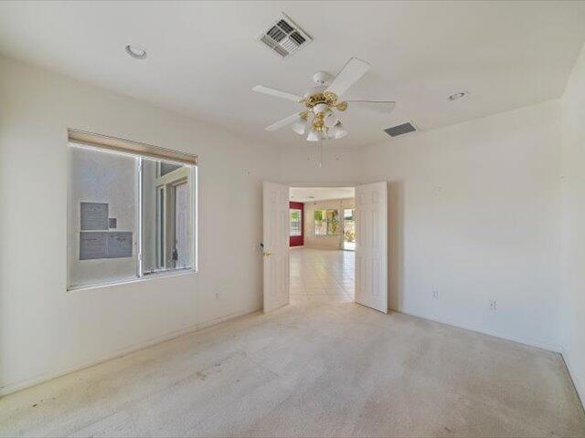 Welcome to Sun City Palm Desert, a premier 55+ gated golf course community. This HUD-owned St. Croix floorplan offers 3 bedrooms and 2 bathrooms with a bright open layout. The spacious primary suite features a walk-in closet, dual vanity, and step-in shower. The kitchen includes an island with a breakfast nook and opens to the living and dining areas, creating the perfect flow for entertaining. Additional features include a two-car garage plus golf cart bay and a private backyard with low-maintenance desert landscaping and a covered patio with ceiling fans, ideal for relaxing and enjoying the outdoors. Residents of Sun City Palm Desert enjoy resort-style living with golf, pools, fitness centers, clubs, and countless activities all in the heart of Palm Desert.