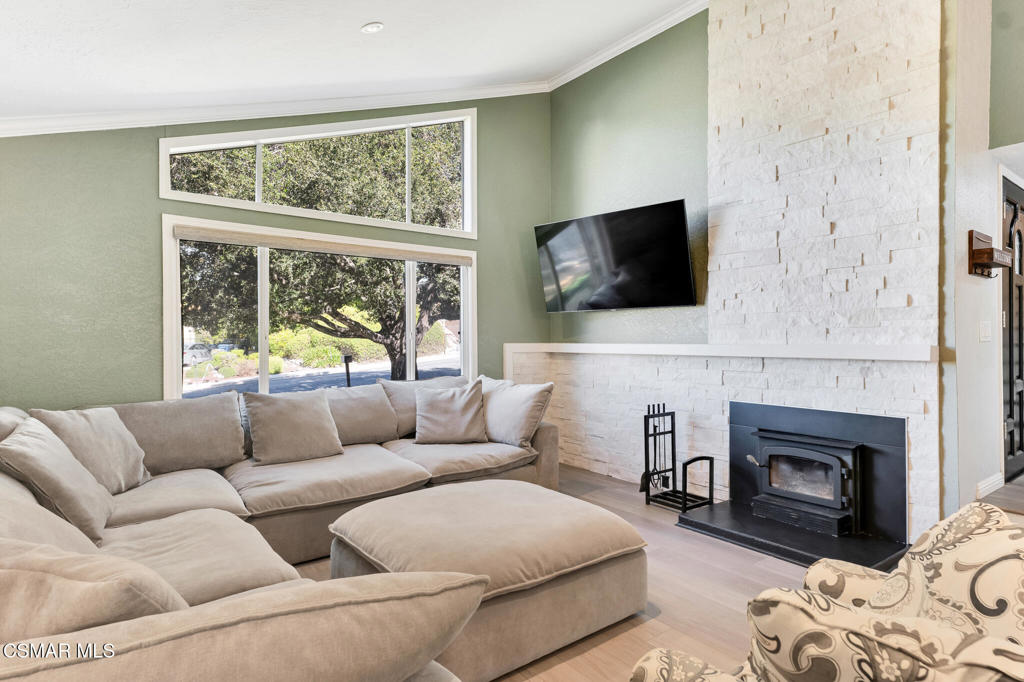 Beneath a breathtaking canopy of five mature oak trees–including one truly massive heritage oak–this exceptional Thousand Oaks property unfolds like a private compound, offering rare flexibility, privacy, and multi-structure potential on a premier corner lot. Expansive new lawns, stacked-stone accents, updated exterior lighting, and new garage doors create striking curb appeal and an estate-like presence that immediately sets the tone. Inside, soaring ceilings and abundant natural light illuminate upgraded flooring and recessed lighting throughout. The formal living and dining areas flow beautifully together, anchored by a dramatic stacked-stone fireplace that adds warmth and architectural presence–equally suited for intimate evenings or lively gatherings. At the heart of the home lies a true French Chef-inspired kitchen designed for serious cooking and entertaining at scale. A professional 6-burner gas range is complemented by four ovens serving distinct functions–including an air-fryer oven–while a massive marble-topped island with bar seating anchors the space. A large prep sink with its own dedicated garbage disposal, extensive custom cabinetry, and recessed lighting throughout ensure both form and function. The oversized island opens seamlessly to the family room, creating an expansive great-room layout ideal for gatherings large or small. Sliding glass doors enhance the connection to the outdoors, opening to the serene backyard beyond. A downstairs bedroom and full bath provide exceptional flexibility for guests, multigenerational living, or a private home office. Upstairs, the spacious primary suite features a walk-in closet and newly remodeled en-suite bath. Two additional bedrooms, an upgraded hall bath, versatile loft space, upstairs laundry, and a walk-in attic with extensive storage and potential future expansion complete the upper level. One of the most compelling features of this property is the fully finished 25′ x 22′ climate-controlled flex studio garage, offering ~600 square feet of additional living-style space beyond the main home (not included in MLS square footage!). Thoughtfully upgraded far beyond a traditional garage, it includes fully insulated walls and ceiling, heating & air conditioning served by the home’s HVAC system, oak flooring, closet storage, three dimmable recessed LED lighting zones, two remote-controlled LED ceiling fans, an insulated garage door, and a private exterior entrance with dedicated exterior lighting, and built-in cabinetry including hot & cold water plumbing with a fully roughed-in sink connection beneath cabinet space–ideal for a future kitchenette! A full bathroom is located just steps away in the main home, with potential to add a bathroom within the space. This rare apartment-style flex area offers exceptional versatility and may function as a guest suite, separate living quarters, private-entry office, studio, gym, multigenerational space, or potential future ADU-style conversion.–a level of adaptable space rarely found in Thousand Oaks. Tucked into a private rear corner of the lot beside a seasonal stream and surrounded by mature foliage sits a separate 18′ x 10′ fully electrified structure complete with interior and exterior lighting, upgraded outlets, and security lighting. Outfitted with built-in cabinetry and generous counter space, this detached retreat provides remarkable flexibility as a workshop, art studio, hobby space, gym, or peaceful backyard office immersed in nature. The backyard itself feels like a private park, with multiple patio areas, drought-conscious landscaping, and remarkable privacy beneath 5 mature oaks forming a stunning natural canopy. It is rare to find this combination of lot size, tree coverage, and multi-structure flexibility within Thousand Oaks. Ideally located near award-winning Conejo Valley schools, parks, hiking & biking trails, and convenient access to the 101 freeway, this is far more than a remodeled home-it is a rare com…