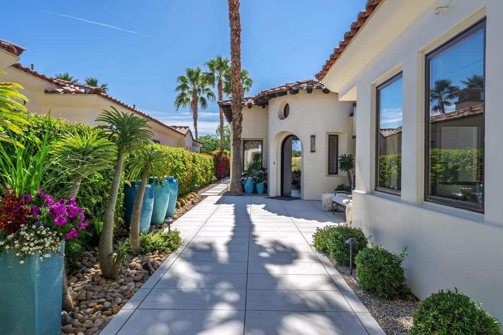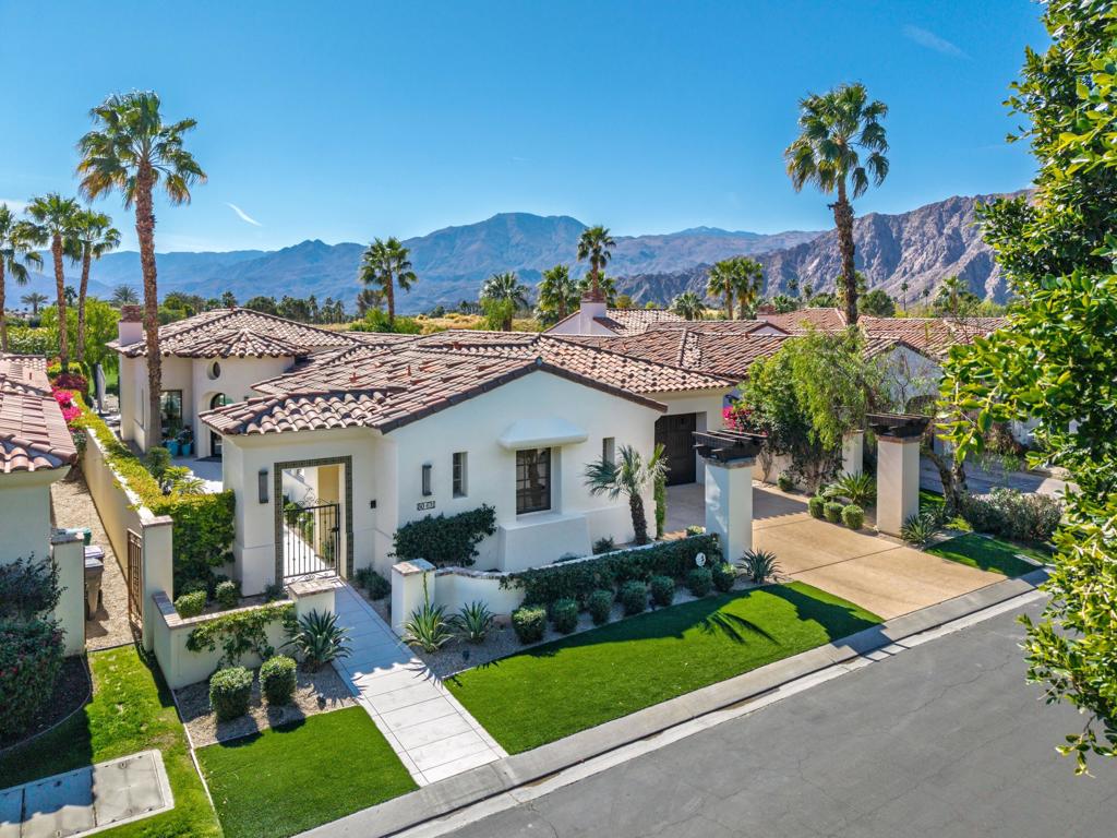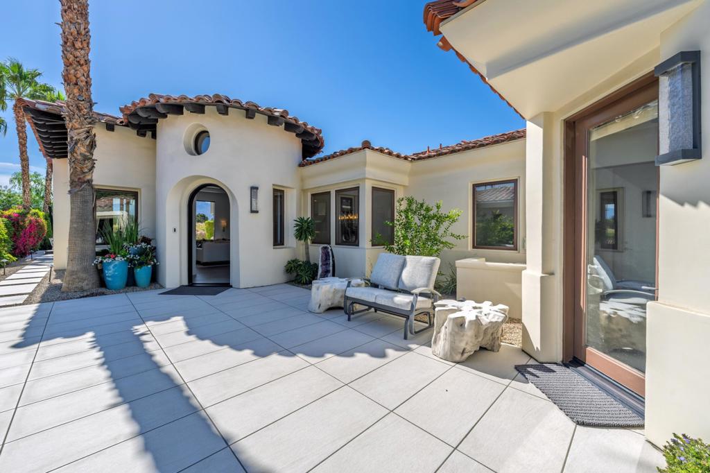 Step into timeless elegance with this meticulously updated south-facing villa, showcasing the largest and most sought-after villa floor plan in the prestigious Hideaway Golf Club. With 3 spacious bedrooms plus a dedicated office, 3.5 spa-inspired bathrooms, and a dramatic rotunda-style entrance, this home blends architectural charm with modern comfort. Every detail of the interior has been thoughtfully crafted–from the custom lighting to the premium finishes and textures throughout. The airy great room flows effortlessly into a stylish bar and a chef’s kitchen featuring high-end appliances, custom cabinetry, and elegant stone surfaces–perfect for both entertaining and everyday comfort. The tastefully designed primary suite is the ultimate private sanctuary, featuring a luxurious en-suite bath with an inviting soaking tub, walk-in shower, and dual vanities. Each guest bedroom suite is beautifully appointed and strategically positioned for privacy and relaxation, featuring beautiful tilework and upscale fixtures throughout. Step outside to a tranquil outdoor entertainment area, ideal for dining under the stars, lounging by the pool and spa, or gathering around the fireplace. All this while enjoying panoramic views of the 5th hole of the Clive Clark golf course and the majestic south-facing mountains beyond. This villa is more than a home–it’s a statement of style, comfort, and elevated living. Discover the art of desert luxury at The Hideaway.