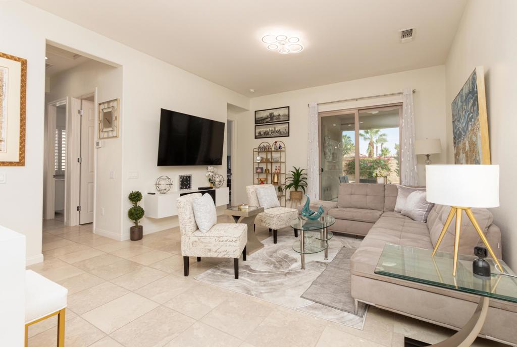 This beautifully remodeled home is move-in ready and packed with modern upgrades throughout. Featuring 2 bedrooms, 2 bathrooms, and a versatile den; complete with a custom tall barn door, and wardrobe for which the den can be used as a 3rd bedroom. This home offers both comfort and style. Enjoy brand new luxury vinyl wood flooring that complements the existing natural tile, creating a cohesive look. The entire home has been thoughtfully updated with recessed can lighting, four new ceiling fans, and new electrical outlets for added convenience. The spacious kitchen showcases stunning new quartz countertops, abundant cabinet space, and updated fixtures. In the living room, a sleek floating fireplace adds a contemporary touch of ambiance to the home. Additional upgrades include new faucets in both bathrooms and the kitchen, elegant window shutters, and energy efficient double pane windows. You can step outside to a low-maintenance backyard with artificial grass and a new sprinkler timer, perfect for easy outdoor enjoyment. The yard has been also beautifully manicured with rock and lush green trees reflecting our natural desert environment. Sun City Shadow Hills is an active lifestyle 55+ golf community that is surrounded by stunning mountain views. While exploring the ground, you’ll notice the meticulously kept Schmidt-Curley, Inc. design 18 hole golf course. Included in the breathtaking gold landscape are the beautiful ponds, which add nothing but tranquility to your day. Unwind in the clubhouse, a hub of weekly fun activities and connection, or visit the library to nurture your mind. Maintain mind and body health by using the fitness center or many other amenities which include: tennis, pickle ball, bocce and so much more. Call for more information.