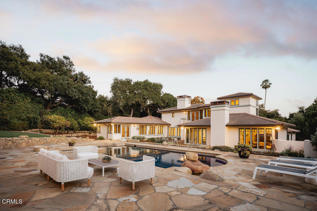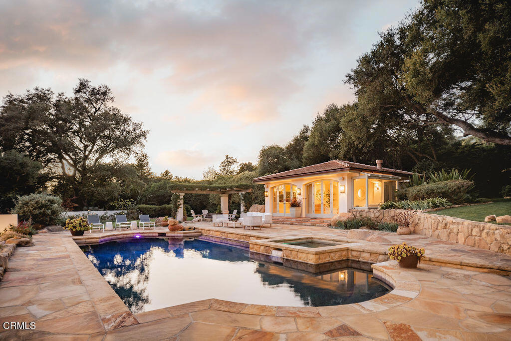 Nestled within the serene embrace of Riven Rock enclave, this 4-bed, 2.5-bath estate with a detached guest/pool house with a full bathroom — totaling 4-beds, 3.5-baths — offers the ultimate retreat for those who value both sophistication and seclusion. Behind mature oak groves and thoughtfully designed privacy gardens, this extraordinary mountain view estate represents a labor of love — thoughtfully updated by the current owners. From the moment you arrive via the newly stamped concrete driveway, flanked by elegant stone columns and walls, you’ll appreciate the seamless blend of architectural integrity and modern luxury that defines this remarkable property. You will be greeted by Brian McNally’s breathtaking commissioned stained glass installation, ‘Ivy Lane at Riven Rock’. Step through the new double front doors and into the living area with sweeping views of the pool and park-like grounds, along with a fully refurbished barbecue area with new wall tile.The heart of your home – a stunning gourmet kitchen – showcases Viking appliances, including a gas stove, microwave, and wine refrigerator that work alongside a Miele dishwasher, all complemented by gleaming quartzite countertops, custom copper sink and faucets, and beautifully refreshed cabinetry with copper hardware. Enjoy the warmth of the sun in the glass breakfast room while overlooking your private English garden. Energy-efficient custom Milgard windows with 3M film and matching French doors blur the boundaries between indoor and outdoor living, all beautifully framed by Hunter Douglas Silhouette remote control shades with imported Italian fabric over-drapes. Throughout the home, natural wood floors have been expertly refinished and stained, while gas fireplaces in the great room, library, and primary bedroom create intimate gathering spaces.The primary bedroom looks over the stunning backyard and up at the picturesque mountains. The primary bathroom has been transformed into a spa-like sanctuary with new quartzite countertops, a distinctive Kohler Dutch Master blush floral sink, glass shower doors, and updated plumbing. With 3 additional bedrooms in the main house, every room benefits from comprehensive updates, including new interior doors and hardware, refreshed lighting fixtures, and the peace of mind that comes with a new ProTec security system. When it’s time to entertain, your guests will be enchanted by the resort-style pool, complete with a detached pool house with more space to enjoy.