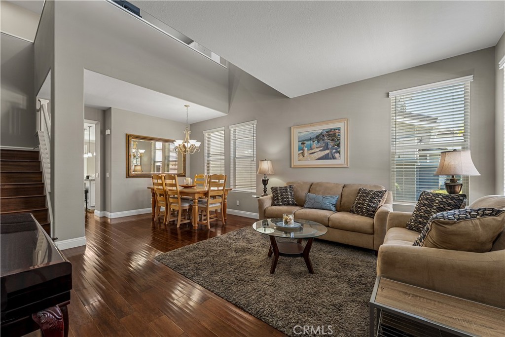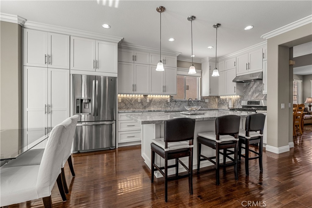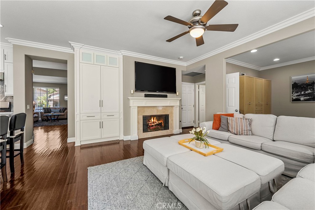 Beautifully upgraded 5 bedroom, 3 bath home offering approximately 2,300 sq ft in a desirable Anaheim Hills neighborhood. Rich hardwood flooring runs throughout the home, including the staircase, creating a warm and elegant first impression. The formal living and dining rooms are light and bright with abundant windows. The remodeled kitchen features granite countertops with full backsplash, white cabinetry with soft-close doors and drawers, a large center island with pendant lighting, recessed lighting, and stainless steel appliances including an LG counter-depth refrigerator, LG dual oven gas range, Fisher & Paykel dual drawer dishwasher, and Sharp built-in microwave drawer. Custom features include pull-out spice racks, Lazy Susan cabinetry, pantry drawers, and a pull-out trash system. The adjacent breakfast nook has French doors leading to the backyard patio. The kitchen opens to the inviting family room with fireplace, crown molding, ceiling fan, and custom floor-to-ceiling built-in cabinetry. A main-floor office that can serve as a fourth bedroom sits adjacent to a remodeled bathroom featuring a glass-enclosed marble walk-in shower. Upstairs, double doors lead to the spacious primary suite with vaulted ceilings, ceiling fan, and two walk-in closets. The remodeled primary bath offers dual sinks, updated cabinetry, marble countertops, soaking tub, and a separate glass-enclosed marble shower. Two additional bedrooms feature recessed lighting and mirrored wardrobe doors. The loft provides flexible space for a fifth bedroom, bonus room, or office. The hall bath has been remodeled with dual sinks, marble countertops, and marble flooring. Convenient upstairs laundry room. Additional features include crown molding, baseboards and door trim throughout, dimmable recessed lighting and under-cabinet kitchen lighting. The garage includes two 220V outlets for EV charging and additional storage. Ideally located near parks, trails, shopping, dining, and top-rated schools.