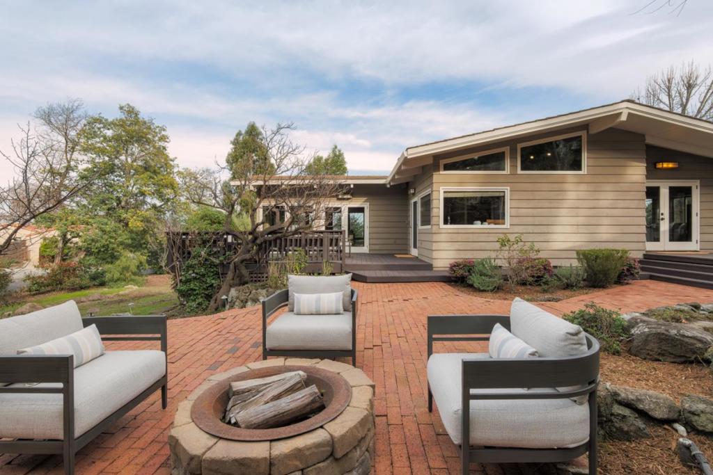 Positioned at the end of a quiet cul-de-sac, this property offers a rare opportunity to own over an acre in a setting that seamlessly blends hilltop privacy with Silicon Valley convenience. Designed to maximize natural light and effortless indoor-outdoor flow, the home is anchored by a dramatic living room and dining room with vaulted ceilings and a classic stone fireplace. The main level features hardwood floors throughout, four bedrooms, and a spacious primary suite with a walk-in closet and serene balcony. Offering exceptional flexibility, the large lower level includes a kitchenette and full bath, ideal for multi-generational living or it can function as a generous family room suited for gatherings both large and small. A detached two-car garage with built-in cabinetry provides ample storage and workspace. Outdoors, multiple decks and a brick patio with a fire pit and fountain overlook mature, park-like grounds, creating inviting spaces for entertaining or quiet retreat. Whether you choose to preserve the existing residence or reimagine the expansive lot to create a new vision, this location is truly exceptional! Enjoy close proximity to top-rated schools, Highway 280, and the Palo Alto Hills Golf & Country Club, all while maintaining a sense of tranquility and privacy.