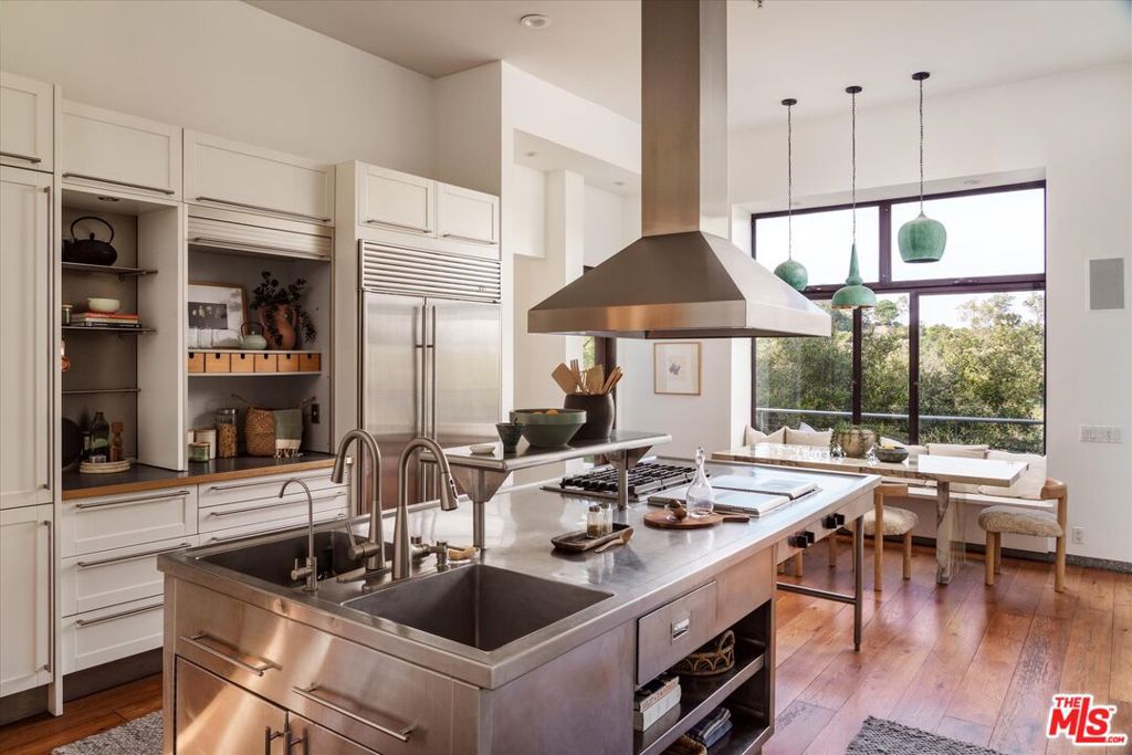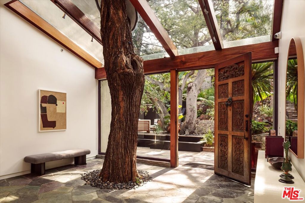 A striking architectural retreat perched at the top of Laurel Canyon, 8882 Lookout Mountain sits across four contiguous lots surrounded by mature trees, offering exceptional privacy and sweeping canyon-to-mountain views. Upon entering you are greeted with a dramatic living room where indoors and outdoors merge seamlessly, anchored by a mature tree growing through the space, and framed by skylights that filter soft light through its canopy. Floor-to-ceiling steel windows capture expansive views throughout. The chef’s kitchen features stainless counters and island, custom cabinetry, and premium appliances, flowing effortlessly into the formal dining room with fireplace. Two additional bedrooms complete this level, one currently styled as a den. The primary suite occupies its own level, creating a true private retreat with a fireplace, walk-in closet, spa bath, and a retractable soaring ceiling. The lower level offers a bedroom, bath, kitchenette, sitting area, and gym ideal for guests, creative studio use, or extended living. The outdoor spaces are equally transporting, with layered decks and patios, an outdoor lounge complete with a pizza oven, and a pool with built-in spa, a sauna, and cold plunge, all set against breathtaking canyon views. With a separate garage, four total parking spaces, abundant natural light, and bold architectural presence, this is a rare hillside compound where design, privacy, and nature converge.