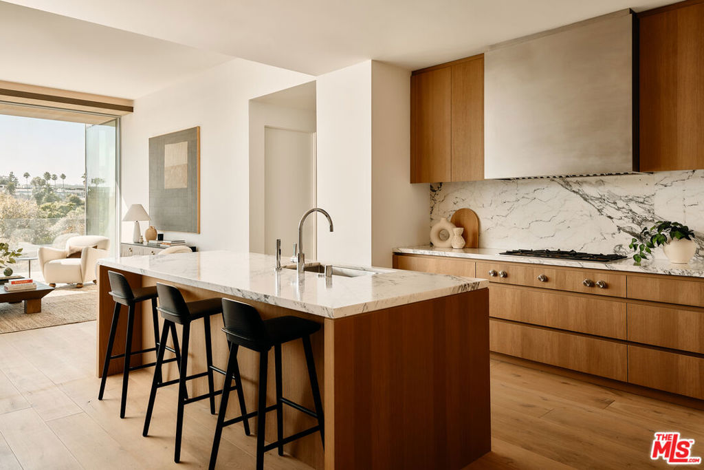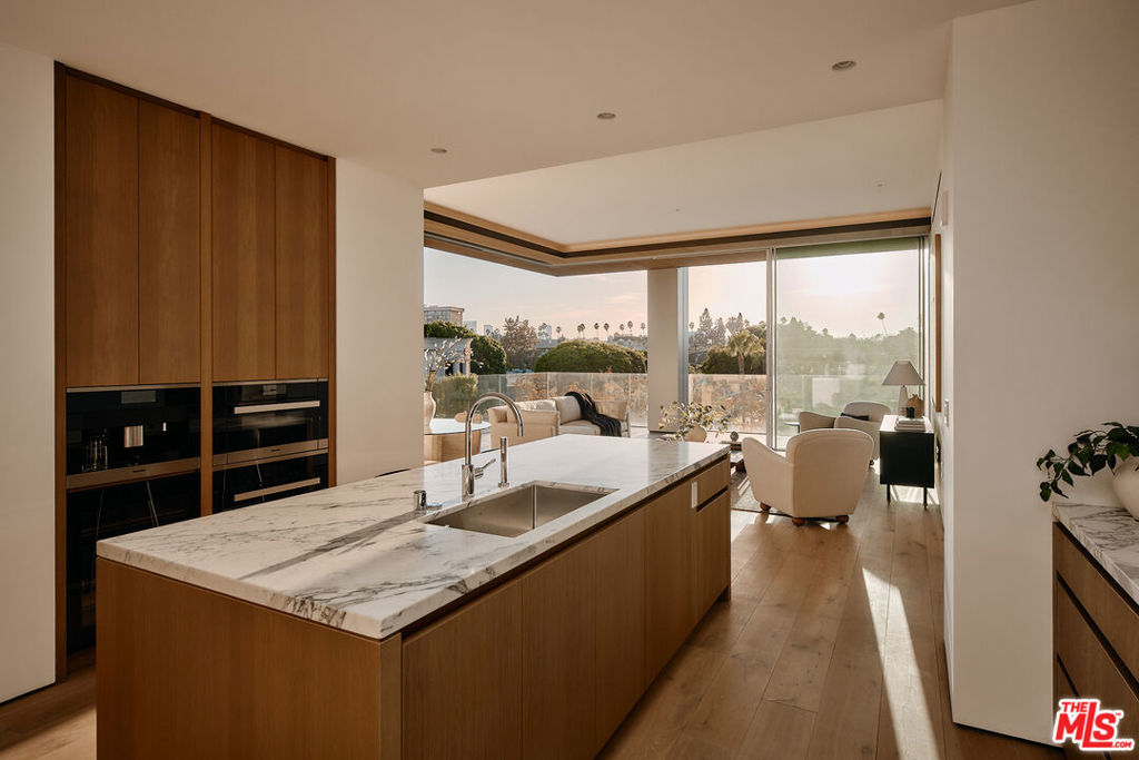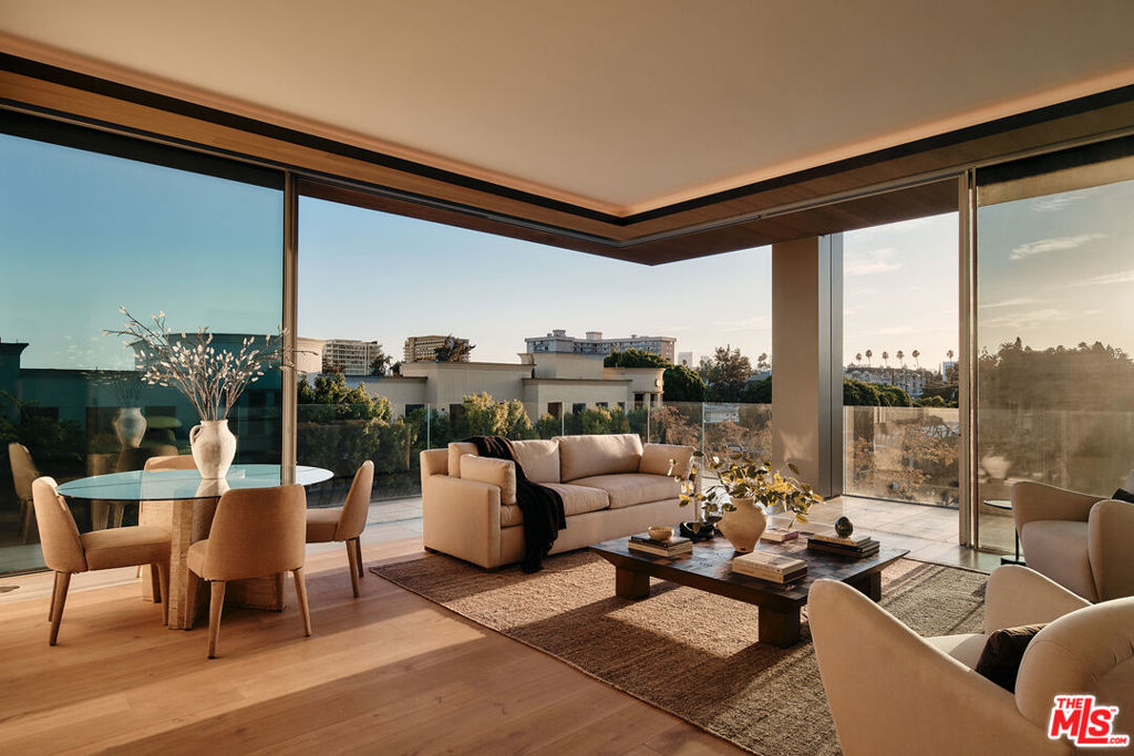 Residence 5C at 8899 Beverly is a meticulously crafted two bedroom, 2.5-bathroom home offering 2,004 square feet of exquisite living space, situated on the sunny southwest corner of one of Los Angeles’ most iconic buildings. Designed with livability and sophistication in mind, the thoughtful floor plan provides ideal privacy, with each bedroom suite occupying opposite corners. A separate laundry room adds convenience and functionality to the layout.The primary suite offers two spacious walk-in closets and access to a private terrace. The en-suite bathroom boasts Italian travertine stone flooring, walls, and countertops, with chrome Dornbracht fixtures and an Agape Spoon XL soaking tub positioned beneath floor-to-ceiling windows. Ceilings soar up to 11′, while Swiss-made Vitrocsa operable glass window walls create a seamless connection between the indoor living space and the wraparound terrace. The custom chef’s kitchen features white oak cabinetry, Italian Calacatta gold marble, and top-of-the-line appliances by Gaggenau, Sub-Zero, and Miele, ideal for both casual meals and entertaining.Residents enjoy a serene, lushly landscaped pool area surrounded by private gardens, offering an oasis of calm in the heart of the city. The outdoor kitchen, dining areas, and cozy fireplace lounges nestled within the garden spaces are perfect for relaxation and social gatherings. Situated in the vibrant heart of West Hollywood’s Design District, this residence is just moments from the city’s finest dining, shopping, and cultural destinations. Whether exploring the neighborhood or retreating to the peaceful sanctuary of your home. The building’s 24 hour valet and concierge services reflect the highest level of residential care. Designed by Olson Kundig as a “love letter to Los Angeles,” 8899 Beverly is recognized as the finest residential building in the city, redefining modern luxury with a masterful blend of artistry, innovation, and timeless design.