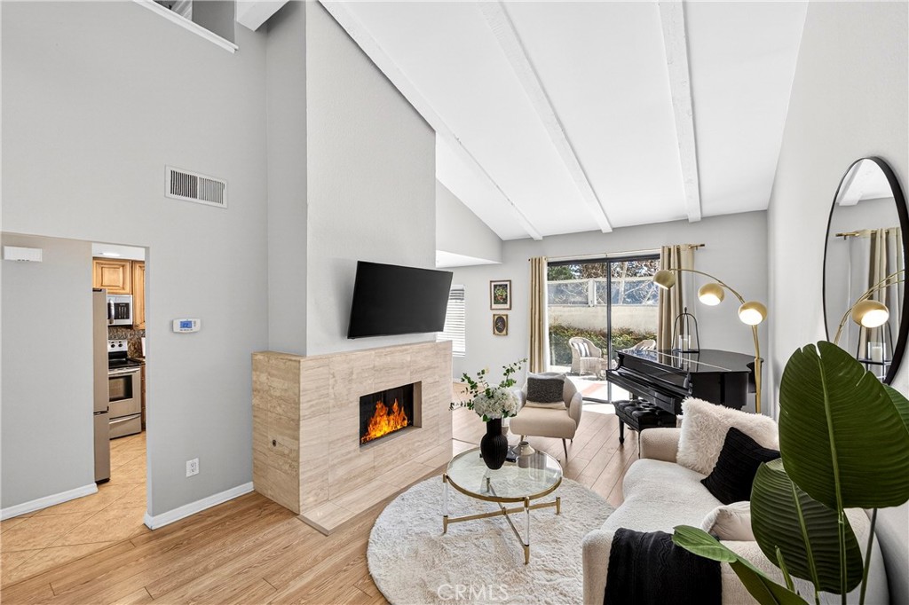 Simply charming and located in the highly desirable Malvern Creek community of Fullerton, this lovely home sits directly across from Amerige Heights Shopping Center. Surrounded by mature trees and lush greenbelts, the neighborhood offers a welcoming and scenic atmosphere. Residents enjoy a quiet, well-maintained community, with beautifully landscaped grounds cared for by the Association. A fantastic opportunity for first-time buyers or investors, this two-story residence features two bedrooms and 2.5 bathrooms. Step inside to a sun-drenched, open-concept layout that flows effortlessly from living to dining to kitchen. The bright, inviting living room is highlighted by a marble fireplace and light laminate and tile flooring throughout, creating a warm and comfortable ambiance. The well-appointed kitchen showcases granite countertops, upgraded cabinetry, granite backsplash, stainless steel/black appliances, refrigerator, and a spacious dining area overlooking the private patio—perfect for morning coffee, outdoor entertaining, or relaxing with pets. A stylish downstairs half bath also features granite countertops. Additional highlights include scraped ceilings, recessed lighting, and plantation shutters. The expansive primary suite offers vaulted ceilings and a large mirrored walk-in closet, while the secondary bedroom also features vaulted ceilings and generous closet space. A sliding door opens to the patio, providing a seamless indoor-outdoor connection ideal for entertaining or enjoying quiet moments outdoors. Additional highlights include direct access to the two-car garage and ample guest parking nearby. The home is located within an award-winning school district, walking distance to Robert C. Fisler School and Sunny Hills High School. Residents also enjoy Association amenities including a pool, spa, clubhouse, and meticulously maintained grounds. Conveniently close to the Buena Park Metrolink Station, restaurants, parks, grocery stores, banks, transportation, and golf courses, this home offers the perfect combination of comfort, style, and convenience.