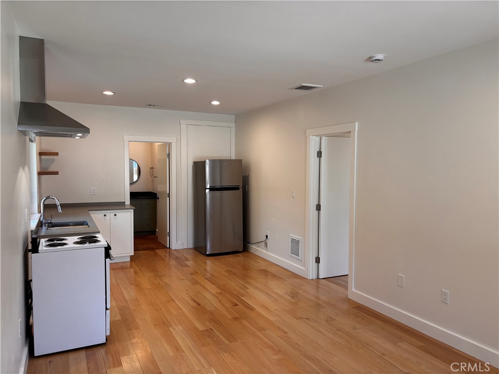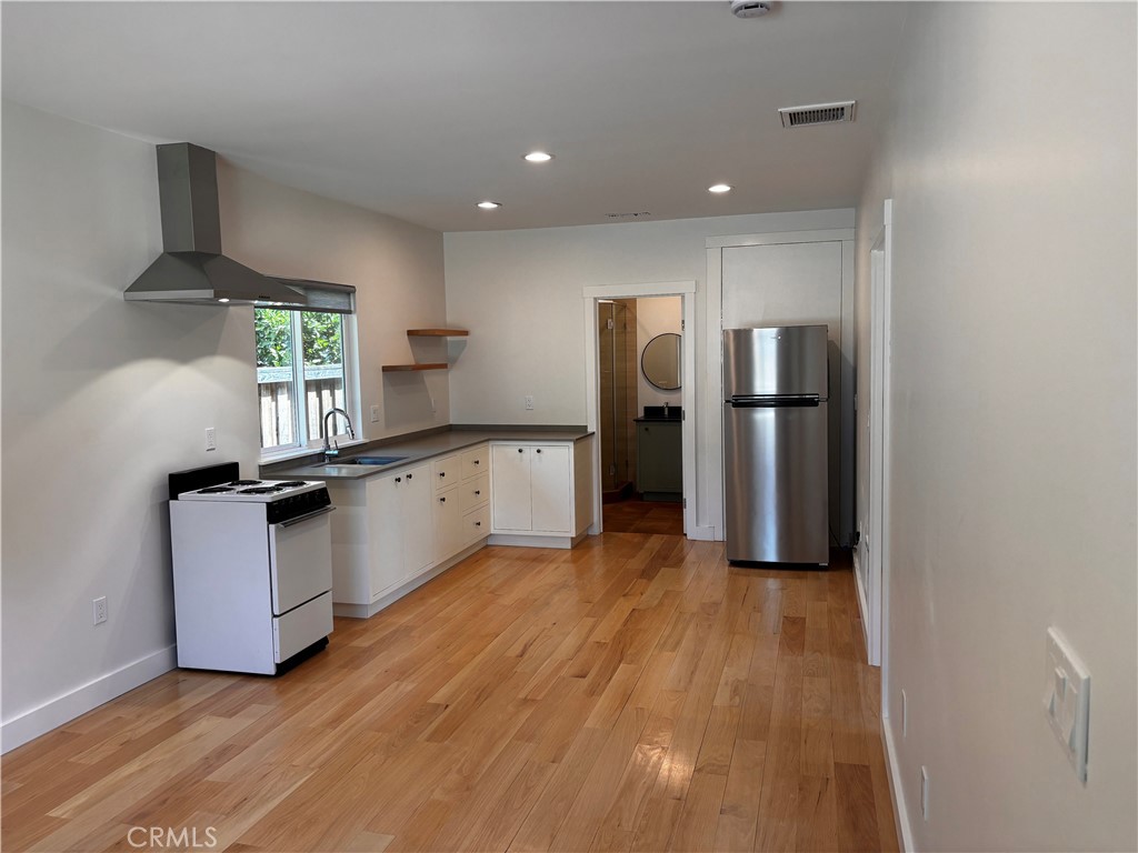 One bedroom with a 3/4 bathroom, 480 square feet with a private entrance. Completely remodeled, light and bright with tall ceilings. Hardwood flooring, newer dual paned windows, can lighting and window shades. The kitchenette is equipped with a refrigerator, four burner electric stove, hood vent, and stainless-steel sink. One off street parking spot assigned at the shared driveway. Shared washer/dryer at garage. Located within walking distance to downtown Claremont, shopping, entertainment, Claremont colleges, public transportation.