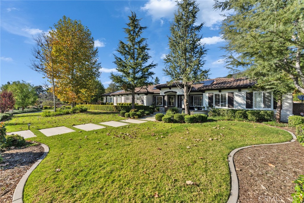 Discover this exceptional single-story estate located in the prestigious Chanteclair neighborhood of Claremont, tucked away on a quiet cul-de-sac surrounded by custom homes and mature landscaping. Built in 2001 and freshly painted inside and out, this rare residence offers soaring ceilings, refined architectural details, and a grand yet comfortable living environment. The thoughtfully designed floor plan features 5 spacious bedrooms, 4 bathrooms, a private office, and a large bonus room. Elegant formal dining, expansive living and family rooms with fireplaces provide ideal spaces for both everyday living and entertaining. The gourmet chef’s kitchen is equipped with premium Thermador appliances, including a 6-burner gas cooktop, oven, warming drawer, built-in refrigerator, wine refrigerator, dishwasher, and hood, along with a GE microwave. The luxurious primary suite offers a spa-inspired bathroom with quartz vanities, a soaking tub, oversized shower, and a walk-in closet. The resort-style backyard is a private retreat, showcasing a Pebble Tec pool and spa with waterfalls, a decorative fountain, and a covered patio with a fully equipped outdoor kitchen featuring a BBQ, bar seating, two refrigerators, and a dishwasher. Additional highlights include 45 fully paid-off solar panels with 2 battery storages (2025), a state-of-the-art 13-camera smart security and alarm system (2025), dual central A/C systems, a gated driveway, four-car garage, upgraded irrigation system, exterior architectural night lighting, low-maintenance landscaping, and scenic mountain views. Conveniently located near The Claremont Club, Whole Foods, shopping, dining, and top-rated Claremont schools, this move-in-ready estate offers a rare opportunity for luxury single-level living.