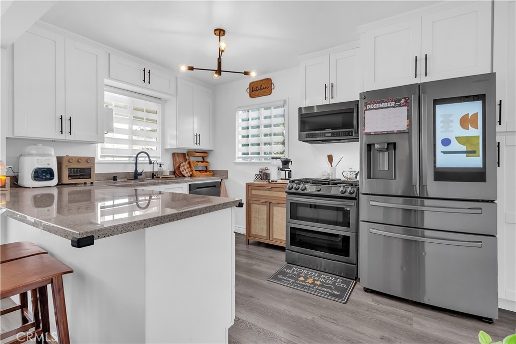 Welcome to this beautifully updated 3-bedroom, 2-bathroom home tucked away on a quiet cul-de-sac in one of Downey’s most desirable neighborhoods. The inviting living room is filled with natural light and flows seamlessly into an open-concept layout, creating a warm and welcoming atmosphere. The modern kitchen features bright white cabinetry, ample granite counter space, and bar seating ideal for casual dining and entertaining. The spacious primary suite offers dual closets and a private en-suite bathroom. Step outside to a backyard designed for relaxation and entertaining, complete with a patio, built-in BBQ grill island, and gazebo. Additional highlights include a large driveway with ample parking, an attached two-car garage with ADU potential, and gated RV parking. Recent upgrades include a new 2025 central air conditioning system with new ducting, double-pane windows, upgraded window blinds, new rain gutters, Govee exterior lighting, interior washer and dryer, and solar panels for long-term energy efficiency. Striking curb appeal in a prime location near shopping, major freeways, and top-rated schools. Schedule your tour today!