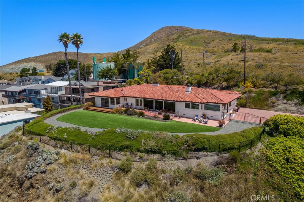 New price! Experience the very best of coastal California living in this exceptional single-level home perched on an oversized 0.6-acre lot in the heart of Cayucos. With breathtaking panoramic views of the Pacific Ocean, coastline, and iconic Morro Rock, this spacious 3,337± sq ft residence offers an unmatched combination of luxury and privacy. Step inside to a bright and airy layout featuring three bedrooms, three bathrooms, a bonus room, and a home office. The kitchen boasts white cabinetry, marble countertops, a breakfast nook, and picture windows that frame the stunning ocean and Morro Rock views. Relax and unwind in the elegant living and dining areas, both showcasing expansive coastal vistas and a cozy wood-burning fireplace. The bonus room adds an element of fun with a bar, pool table, fireplace, and built-in bed nook. The primary suite is a true retreat with panoramic ocean views, backyard access, dual closets (including a walk-in), and an en suite bathroom with marble finishes. Two additional bedrooms also feature generous layouts and ocean views. Outside, the oversized lot offers endless potential with five legal lots on two APNs; perfect for expansion, gardening, or even subdivision (buyer to verify). The oversized four-car garage/workshop includes insulated walls, an office with ocean views, and ample space for hobbies or storage. Additional highlights include a dedicated home office with built-ins and ocean views, a generous utility room with pantry storage, a sink, and secondary refrigerator, multiple bathrooms with updated tile and marble finishes, French doors leading to a private backyard, and luxury vinyl plank and tile flooring throughout. This is a rare opportunity to own a one-of-a-kind property with unparalleled views, generous space, and incredible potential, all just minutes from downtown Cayucos and the beach.