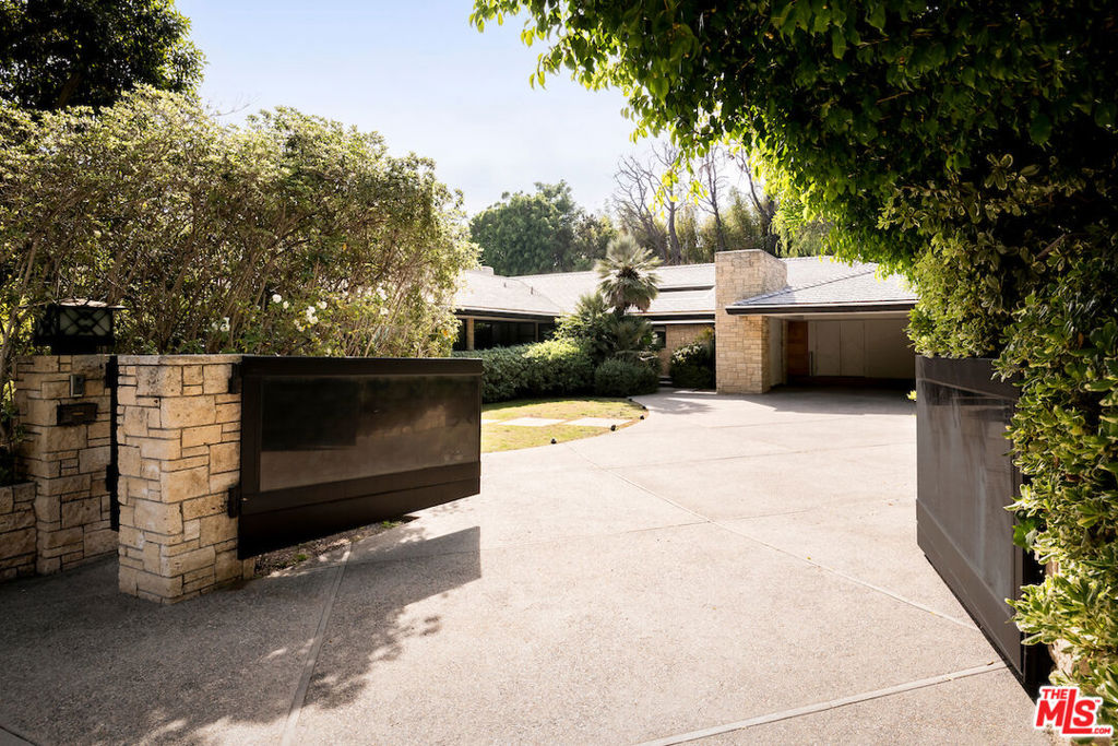 Situated in the coveted lower Trousdale Estates of Beverly Hills, this gated Mid-Century residence offers single-level living on a sprawling 21,600-square-foot lot. Clean architectural lines and a refined, open layout define the interiors, offering a seamless blend of classic design and modern livability. A formal entry unfolds into a refined composition of living spaces, including a formal living room with fireplace, an intimate den with a second fireplace, and a formal dining room, each framed by walls of floor-to-ceiling glass and sliding doors that bathe the interiors in natural light while seamlessly dissolving the boundary between indoors and out. The newly updated kitchen is both functional and striking, featuring dual islands, top-tier appliances, and a substantial walk-in pantry. A private office is thoughtfully integrated into the layout. The main residence comprises four bedrooms, anchored by an expansive primary suite offering dual walk-in closets and a spa-caliber en-suite bath appointed with a soaking tub, separate shower, and a generously scaled vanity. A detached approximately 950-square-foot guest house with one bedroom and one bathroom provides a private and well-appointed retreat for guests. The grounds evoke a tranquil, resort-like setting, enveloped by mature landscaping and dotted with abundant citrus trees that enhance both privacy and ambiance. A large pool with a diving board serves as the focal point of the outdoor experience, complemented by a covered patio with fireplace and a fully equipped outdoor kitchen designed for effortless al fresco living and entertaining. Subtle peek-a-boo city views complete the offering. A rare opportunity to own a timeless Mid-Century residence in one of Beverly Hills’ most prestigious enclaves, moments from the city’s finest dining, shopping, and entertainment.