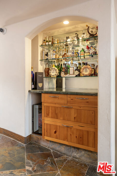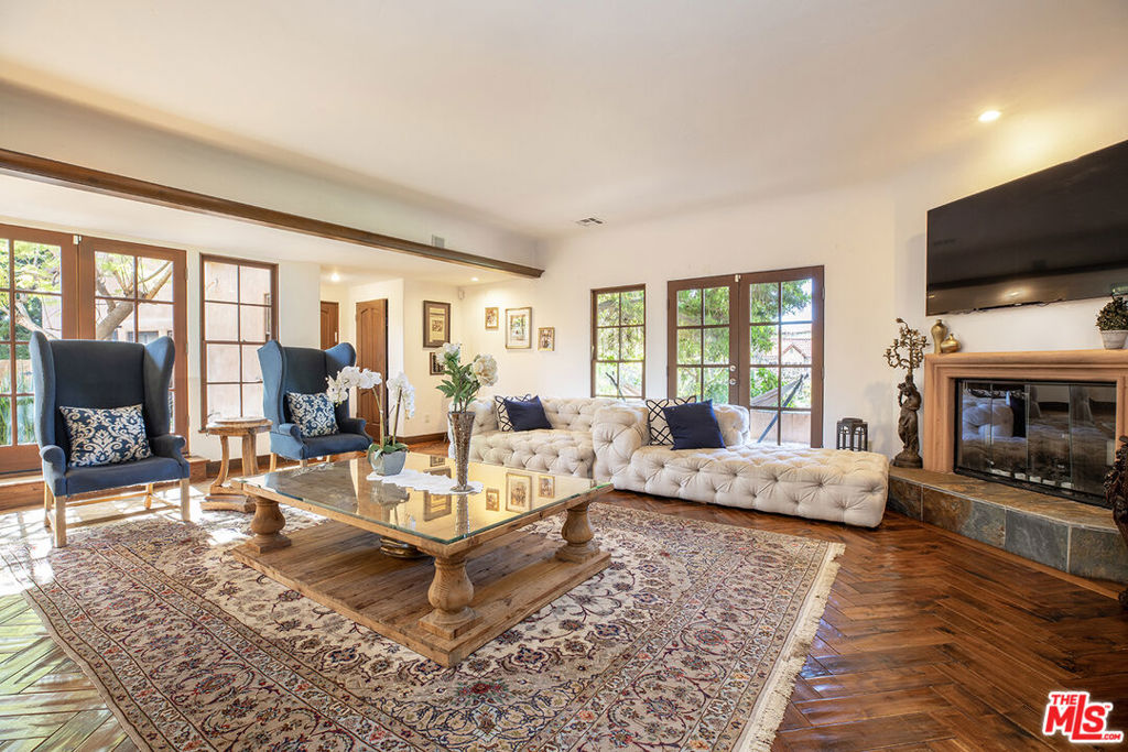 Nestled in the prestigious Comstock Hills neighborhood, this magnificent Spanish-style Westwood estate thoughtfully reimagined by an architect-owner in 2009 offers the rare combination of timeless architecture, generous space, and an unbeatable Westside location. Spanning 4,600 square feet on a lush 9,737 SF lot, this entertainer’s dream home unfolds across two beautifully appointed levels. The grand living room anchors the main floor as French doors spill out onto front and side patios, seamlessly blending indoor and outdoor living. A dramatic dining room with soaring beamed ceilings and French doors to the garden sets the stage for memorable dinner parties, while the chef’s kitchen features granite countertops, double ovens, and a sun-drenched breakfast nook with a skylight with views of Century City. A warm library/office with garden views provides a quiet retreat, while the expansive family room with its beamed ceiling, tile floors, and private entrance offers ideal flexibility for a media room, playroom, or home gym. Two bedrooms and baths and an expansive guest or maid’s suite with its own private patio complete the downstairs. Upstairs, the serene primary suite opens to a sweeping balcony and features a spa-like bath with Jacuzzi tub, skylit shower, his-and-hers vanities, and generous walk-in closets. Also upstairs are a secondary en-suite bedroom, a spacious adjacent bedroom, and a bonus room perfect as a nursery or home office, all with tree-top vistas. The generous yard offers plenty of space for barbecues, gardening, play, or simply soaking in the California sun. A 2-car attached garage provides secure parking and easy access. All appliances included, including refrigerator, washer, dryer, dishwasher, microwave, and range/oven. Central AC/heat keeps things comfortable year-round. Located on a tranquil residential street, just minutes to Century City, Beverly Hills, UCLA, Westwood Village, and the 405 freeway. Zoned for highly-regarded Fairburn Avenue Elementary. This upscale enclave delivers walkability, a quiet residential setting, and Westside living at its finest–ideal for professionals, families, or those seeking a rare full-size home in the heart of the city.