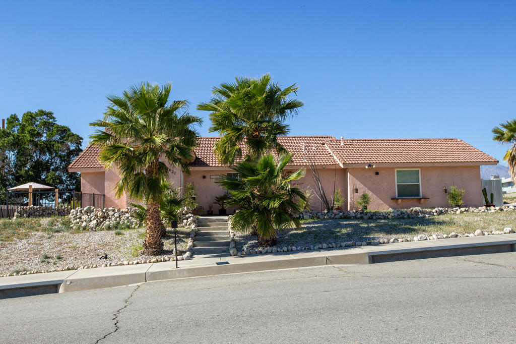 Welcome to this very remarkable 3-bedroom, 2-bath hilltop retreat offering panoramic views for miles and miles….truly a rare opportunity to own a home that sits above the valley with breathtaking west-facing mountain scenery from nearly every window!Perched on an elevated corner lot, this exquisite residence provides enhanced privacy and spectacular backyard views, complete with a saltwater above-ground pool…perfect for relaxing or entertaining on warm desert days. Photos truly tell the story, but experiencing these views in person is unforgettable.Inside, you’ll find tile flooring, a bright kitchen featuring granite countertops, warm wood cabinetry, stainless steel refrigerator, skylight, and large windows that flood the space with natural light. The spacious primary suite offers a modern bath with veined quartz shower, frameless glass enclosure, and walk-in closet for added comfort and convenience.Additional highlights include a 2-car garage, ample gated RV-sized parking, plus a storage shed — practical features that are always a big plus. And best of all… NO HOA!Step just a few feet across the street to trailheads, dog-walking areas, and the beautiful Swiss/Bryce’s Canyon Trail…ideal for hiking, biking, and enjoying scenic desert and mountain views.Why pay Palm Springs prices when you can spend so much less and still be just a short drive away? Properties this special….with privacy, views above the valley, outdoor recreation at your doorstep, and room for all your toys…are almost impossible to find.Come see it for yourself… this serene desert escape is ready to impress!!