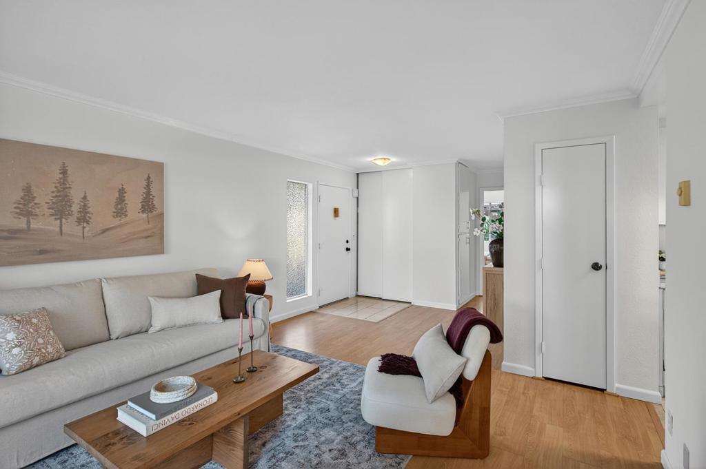 Set back from the street for added privacy and tranquility, this light-filled two-bedroom, one-bath end-unit offers comfortable living in a central Mountain View location. A tiled foyer opens to the ideal open-concept living spaces finished in a soft, neutral palette. The living room features light-hued engineered wood floors and sliding glass doors that open to a private fenced yard. An open dining area with yard-view windows is connected to the kitchen by a convenient pass-through for effortless entertaining. The kitchen includes deep countertops, white cabinetry, generous pantry storage, and a porcelain sink. Both bedrooms are privately situated with picture windows, large closets, and easy access to the nearby full bath. The yard offers a large concrete patio, a mature shade tree, and manicured plantings. Additional highlights include a community pool and clubhouse, covered carport parking with storage, ample guest parking, and a convenient Mountain View setting close to Google and other top tech employers, wonderful downtown amenities, and commute routes to all of Silicon Valley.