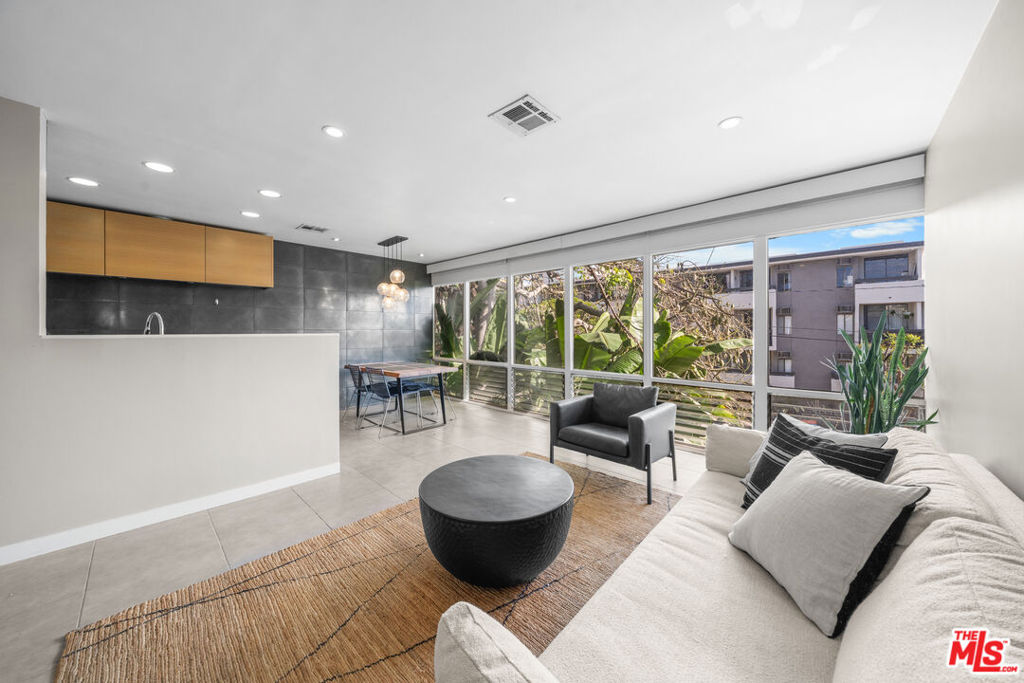 Set in a classic mid-century building, once the backdrop for several iconic David Hockney paintings in the 1960s, this rare, front-facing top-floor condo captures the essence of West Hollywood living. Floor-to-ceiling windows flood the home with natural light, framed by swaying palm fronds, while an open floor plan with recessed lighting offers a seamless flow throughout.The kitchen is thoughtfully designed with Caesarstone countertops, under-cabinet lighting, a stainless-steel Bertazzoni range, and a refrigerator and dishwasher discreetly integrated into the cabinetry. The primary bedroom and bathroom enjoy peekaboo views of downtown, while both bedrooms feature double-paned windows for added comfort and sound insulation. A full bathroom with a tiled shower and an exceptionally long hallway closet provide ample storage.The well-maintained complex offers a pool, laundry room, BBQ area, secured key-fob entry, one-car garage parking, and two additional storage spaces. Enjoy easy access to top coffee shops, restaurants, boutiques, Sunset Plaza, and iconic music venue, plus Santa Monica Blvd nightlife just moments away, without the noise.