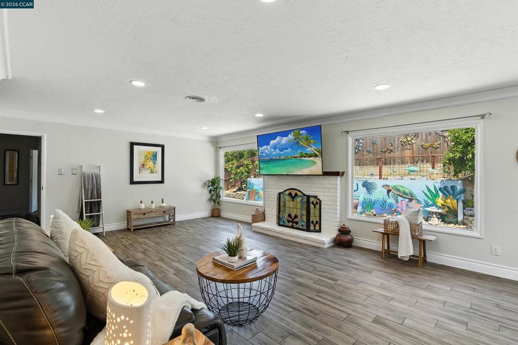 Rarely available & beautifully refreshed, this move-in ready single-story home offers 3 bedrooms and 2 bathrooms on a premium corner lot featuring a spacious, fully fenced front yard — perfect for outdoor enjoyment, pets, or added privacy. Inside, light-filled living spaces welcome you w/ large windows, elegant tile flooring, & a warm fireplace that creates a natural gathering place in the living room. The updated kitchen showcases SS appliances, granite tile countertops, & tasteful finishes ideal for both daily living & entertaining guests. The hall bathroom has been stylishly renovated w/ contemporary touches, while the converted garage provides valuable flexible space suited for a home office, fitness area, playroom, or guest retreat — easily tailored to your needs. Important upgrades include a newer roof & water heater, fresh exterior paint, & an upgraded electrical panel, delivering efficiency & peace of mind. Additional features include crown molding, recessed lighting, mirrored closet doors, hardwood flooring in the bedrooms, and a spacious backyard w/ mature persimmon and tangerine trees plus a handy storage shed. Thoughtfully improved & full of charm, this exceptional property offers comfort, versatility, & a rare single-level opportunity in a desirable location.