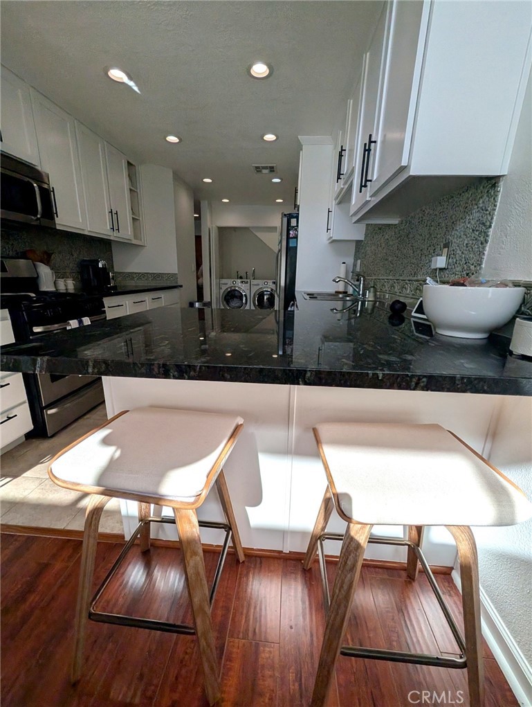 Beautifully upgraded and light filled two story loft residence in the Sherman Village community, approximately 1,160 square feet of thoughtfully designed living space with high ceilings and an open concept layout. The kitchen features white cabinetry, granite countertops, recessed lighting, and a functional galley layout with plenty of storage. Adjacent laundry room includes side by side washer and dryer. Additional features include Two subterranean tandem parking spaces Vaulted ceilings Updated fixtures and finishes Loft Ample closet storage Sherman Village features amenities including pools, spa, sauna, landscaped courtyards, and secure entry. Located near dining, retail, fitness centers, production facilities, educational institutions, and major freeways including the 101 and 405.