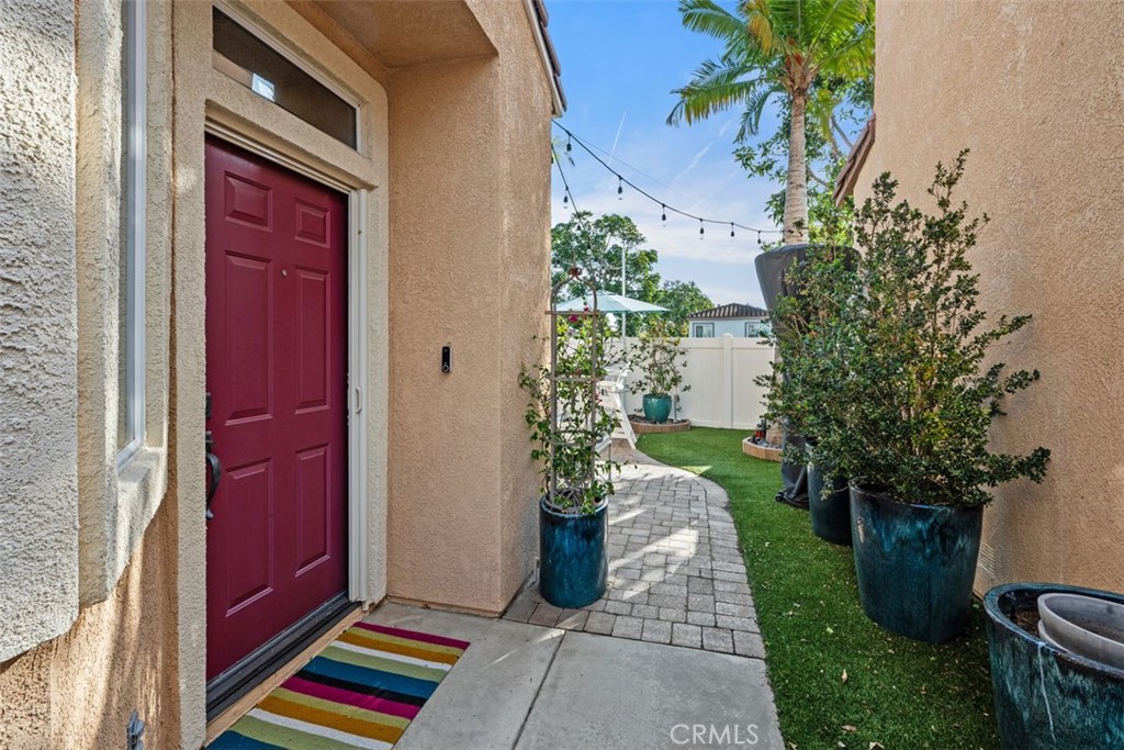 Nestled on a premier greenbelt corner lot within the highly desirable Flores Los Alisos community, this beautifully detached 3-bedroom, 2.5-bath residence offers a rare blend of privacy, warmth, and refined design. From the moment you enter, natural light fills the home, creating an atmosphere that feels both open and intimate. The living space is anchored by a charming white brick-style fireplace—an inviting focal point for quiet evenings or gathering with friends and family. A sunlit stair landing framed with plantation shutters adds architectural character and soft filtered light to the upper level. At the heart of the home, the remodeled kitchen is as stylish as it is functional. Turquoise glass tile adds a subtle pop of personality, while stainless steel appliances, designer fixtures, and a rich wood bar top create a space that feels thoughtfully curated and effortlessly welcoming. Whether hosting dinner parties or enjoying a slow Sunday morning, this kitchen truly lives beautifully. Upstairs, the primary suite feels like a private retreat. The spa-inspired bath has been fully remodeled with striking black-and-white parquet-style flooring, custom dual vanities, premium hardware, and carefully selected finishes that elevate everyday living. All bathrooms throughout the home have been remodeled with the same attention to detail, and fresh interior paint enhances the bright, polished feel from room to room. Step outside and discover a wraparound backyard designed for connection and comfort. Custom pavers, low-maintenance vinyl fencing, and a built-in stainless steel outdoor kitchen with rotisserie set the stage for relaxed evenings under the Southern California sky. With only one adjoining neighbor, the setting feels peaceful and secluded—yet just moments from parks, scenic trails, and local schools. This is more than a home—it’s where mornings begin with sunlight spilling through your windows, evenings are spent entertaining or unwinding in your private backyard oasis, and every day feels effortlessly inspired by the beauty, comfort, and lifestyle that Flores Los Alisos offers.