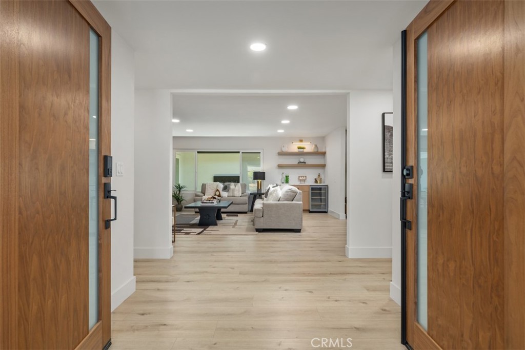 Welcome to 13762 Palace Way — a stunning single-story ranch-style pool home, beautifully reimagined with timeless design and high-end finishes. Perfectly positioned on a quiet cul-de-sac and set on an expansive nearly 10,000 SF flat lot, this residence offers the ultimate blend of comfort, sophistication, and California indoor-outdoor living. Step through the walnut double doors into 3,104 SF of thoughtfully designed living space, featuring 5 bedrooms, 2.5 bathrooms, and 2 versatile BONUS ROOMS ideal for a home office, media lounge, gym, or guest suite. An airy open-concept floor plan is bathed in natural light from abundant windows, sliders, and a skylight. At the heart of the home is the showpiece chef’s kitchen, showcasing a 36” stainless steel gas range with hood, beverage cooler, oversized center island with seating, Taj Mahal quartzite counters and backsplash, sleek White Oak cabinetry, and designer lighting. The kitchen flows seamlessly into the dining room with its cozy gas fireplace and skylight, and continues into the spacious family room — complete with a built-in bar, custom built-ins, floating shelves, quartz tops, an electric fireplace, and recessed TV niche — entertaining has never been easier. The primary suite is a true retreat, featuring elegant pendant lighting, mirrored wardrobe, and direct access to a private courtyard. The spa-inspired en-suite bathroom includes a dual-sink oak vanity, dedicated makeup station, walk-in shower with frameless glass door, and an additional mirrored wardrobe. The secondary bathroom is equally refined with a dual vanity, modern sconce lighting, and tub shower combo. Outdoors, discover your private California oasis — a newly remodeled pool, serene courtyard with fountain and fire pit, and an expansive covered patio perfect for entertaining or relaxing. Additional highlights include a 3-car garage with new epoxy floors and overhead storage, brand new AC system with smart thermostat, full PEX repipe, new dual-pane windows and sliders, new water heater, new garage door opener, and smart video doorbell. Plus, low property taxes, NO HOA, and NO Mello-Roos. This exceptional home is the perfect blend of luxury, function, and lifestyle — and truly must be experienced in person!