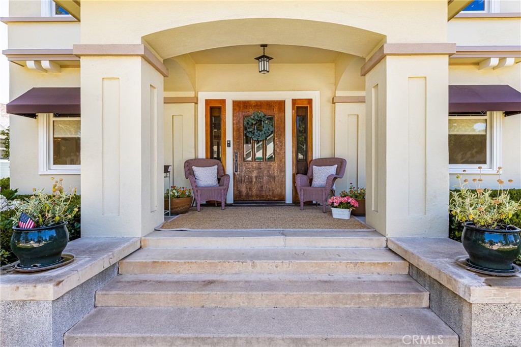Welcome to this ICONIC 1921 Prairie Style home, meticulously designed to embody the essence of Frank Lloyd Wright’s renowned architecture. Nestled on one of Old Towne Orange’s most sought-after blocks, this residence is TURNKEY & sure to impress the most discerning buyer! Step inside to discover 4 bedrooms & 2 full baths, natural wood finishes, complemented by built-in cabinetry. A striking oak front door, flanked by sidelights, invites you into the warmth of the original hardwood floors. The open floor plan seamlessly connects the front living room to the formal dining room, boasting an exquisite built-in china buffet with original leaded glass, custom wood wainscoting & picture rails. The unique French doors lead to a private office/library, complete with built-in secretary, pull-out Murphy bed & ornate wood detailing including leaded glass cabinets & bookshelves. Enjoy moments of tranquility in the sunroom, featuring a coffered ceiling & full-length windows that offer serene views of the yard & pool area. A swinging door gracefully divides the dining room from the gorgeous kitchen, equipped with Wedgewood gas stove, kitchen island & wood-faced built-in refrigerator, crisper drawers & freezer. An original hideaway prep table adds nostalgia & practicality to the space, while black DuPont Zodiaq quartz countertops & shaker-style cabinets exude timeless charm. Upstairs you will find 4 bedrooms, including the primary bedroom with walk-in closet & private balcony, perfect for savoring the neighborhood view. Both bathrooms have been beautifully restored, featuring white tile, pedestal sinks, & showers over the tubs. The upstairs bathroom still retains its laundry chute, conveniently connecting to the main floor mudroom. A custom Dutch door leads to the breathtaking rear yard, featuring a remodeled resort-like pool/spa, complemented by a covered patio & numerous fruit trees. The large basement houses the updated HVAC system, water heater & ample storage space. The long driveway, graced with a Porte-cochere & side door entrance, extends to the detached garage. Recent upgrades include a NEW ROOF, copper plumbing repipe, newer rear sewer line & upgraded 200 amp electrical service panel. Fresh exterior paint & custom awnings add to the home’s immaculate appeal, while the resurfaced pool/spa enhance the outdoor oasis. This property is eligible for the Mills Act property tax reduction program subject to approval. A RARE OPPORTUNITY to own this Historic Masterpiece!