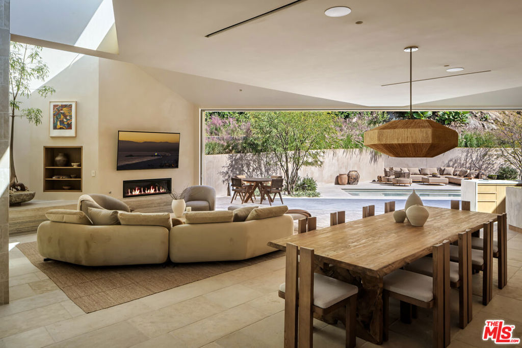 Sculpted Serenity: A timeless design ethos inspired by Amangiri where nature, light, and material exist in perfect harmony. An architectural statement above the Sunset Strip, spanning a single level across 4,600 square feet, where every surface feels sculpted rather than built. Effortless California living through world-class materials. Walls of Moroccan hand-tumbled limestone set a warm, organic tone, complemented by Egyptian limestone floors that flow seamlessly throughout. Custom walnut millwork adds depth and texture, grounding the minimalist aesthetic with natural warmth. The great room unfolds beneath high ceilings that capture shifting light, centered around a Titanium travertine lounge bar a sculptural focal point of the home. Designed for those who value art and beauty, interiors feature expansive art walls with subtle, specialized lighting. The silver-travertine fireplace and powder room bring quiet sophistication, their textures echoing the surrounding landscape. In the kitchen, a travertine hood and bespoke walnut cabinetry reflect refined simplicity and craft. The primary suite is conceived as a world-class spa retreat, with a Gold Dune stone bath, steam shower, and wellness and massage room designed for deep restoration. Each bedroom offers tranquil proportion and a seamless connection to nature. Clad in Accoya wood siding that blends with the hillside, the home feels organically rooted in its environment. A perfectly scaled pool sits in total privacy, framed by mature trees and granite outcroppings a serene retreat where architecture and landscape exist in perfect balance. 4,600 square feet includes garage