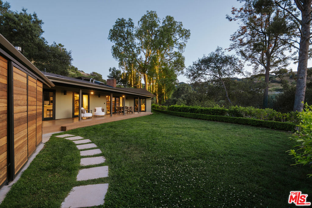 Perched on a rare hilltop lot of over half an acre, this breathtaking single-story Mid-Century Modern residence, designed by esteemed Beverly Hills architect John P. Pedersen, has been extensively reimagined to deliver an exceptional standard of refined living. Set behind a double-gated entry, the property captures sweeping canyon, hillside, and treetop views from its private promontory setting, offering a sense of seclusion just minutes from the heart of Encino. Spanning approximately 3,050 square feet, the home showcases clean architectural lines, a soaring open floor plan, and wall-to-wall French doors that create a seamless connection between interior and exterior spaces. Wide-plank hardwood floors, a gas fireplace, curated built-ins, and custom double-pane windows with bespoke coverings define the main living areas, all filled with natural light. At the center of the home, the gourmet kitchen features an oversized Arctic White marble island, Viking professional appliances, Sub-Zero refrigerator, double ovens, coffee bar, and walk-in pantry, designed to open effortlessly to both the dining and living spaces. Four beautifully appointed bedrooms include two primary suites, each offering walk-in closets and spa-inspired en-suite baths with steam showers, double vanities, and designer finishes. A total of four full bathrooms serve the home with equal attention to detail. A thoughtfully designed collection of additional spaces, including a media room, den/office, and bonus room, provides flexibility for a variety of lifestyles, complemented by an interior laundry room and abundant storage throughout. The outdoor experience is equally compelling, with a covered veranda overlooking panoramic canyon views, multiple terraces, a courtyard fire pit, gazebo, outdoor bar, and jacuzzi, creating distinct spaces for both quiet relaxation and elevated entertaining. Mature landscaping, supported by an automated irrigation system, enhances the natural beauty and privacy of the setting. The double-gated entry, upgraded gate motor, carport, and expansive driveway provide parking for up to five vehicles. Recent capital improvements include foundation and chimney work, a new A/C condenser, surveyed and newly fenced grounds, fire safety eave vents, and a remodeled primary closet, offering both comfort and peace of mind. Located within the coveted Lanai Road Elementary School district, this architect-designed residence presents a rare opportunity to own a truly distinctive property that balances privacy, design pedigree, and accessibility.