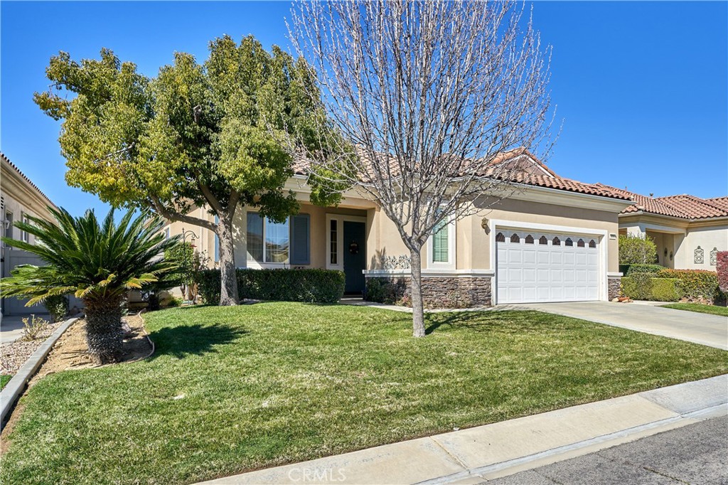 Welcome to this popular and immaculate “Trillion” model in the 55+ 24-hour guard-gated community of SOLERA. This move-in ready home offers a bright, open layout with crown molding, newer stainless steel appliances, and thoughtful upgrades throughout. The living room is filled with natural light and centered around a cozy gas fireplace. The kitchen features quartz countertops, uniquely painted cabinetry, and plenty of space to cook and entertain. A separate den provides flexible space for a home office, hobby room, or guest area. The garage includes additional storage space with room for a potential workbench. Step outside to a private, low-maintenance backyard—perfect for relaxing mornings or easy evenings. SOLERA residents enjoy access to a clubhouse, rec/banquet rooms, pool and spa, fitness center, indoor walking track, tennis courts, bocce ball, and an active social calendar and group trips. The HOA includes FREE basic Spectrum cable and internet. Convenient I-10 access makes commuting simple, with Palm Springs, Redlands, Cabazon Sopping, Morongo Casino, hiking, Joshua Tree and local golf courses just a short drive away. Skip the heavier traffic near Four Seasons and Sun Lakes and enjoy quicker freeway access instead. Welcome to the good life, welcome home to SOLERA!