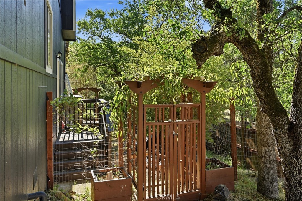 Welcome to 19345 Moon Ridge Rd, where the backyard is a true paradise and the home offers a comfortable lifestyle with space to live, work, and relax. This five-bedroom, three-bath home offers over 3,100 sq ft of living space with unobstructed views of a beautifully landscaped garden featuring a variety of fruit trees, vegetables, herbs, and flowers. Outdoor amenities include a campfire circle, waterfall, stream, large fish pond, two-story arbor covered in wisteria, full-sized Coleman hot tub, outdoor shower, and an automatic drip irrigation system supported by a 3,000-gallon rainwater catchment tank. The living/great room features a built-in fireplace and a corner spiral staircase leading to additional bedrooms, offices, and utility or recreation rooms, with solid core doors in all bedrooms. New paint both interior and exterior with all new flooring throughout makes the home shine. Solar power with battery storage adds efficiency and security, and remotely controlled rooftop sprinklers provide an added layer of protection, making this property well-equipped for comfortable daily living.