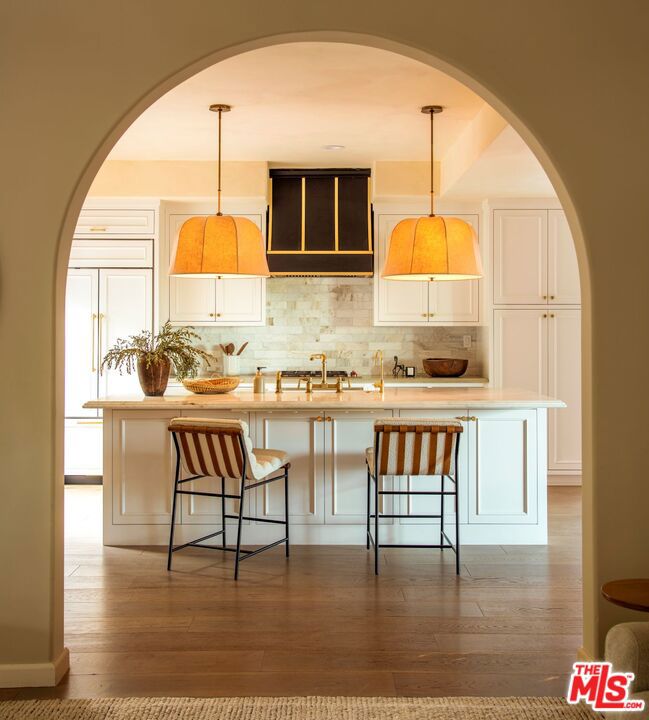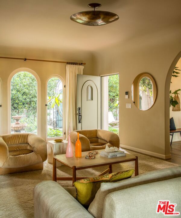 Set along a quiet rise in Los Feliz, this 1926 Spanish Colonial balances historic character with thoughtful, material-driven updates. Lime-washed walls by Portola and soft tones from Farrow & Ball create a sense of calm continuity throughout, while quartzite and limestone surfaces, paired with Waterworks fixtures, bring depth and quiet durability to the kitchen and bathrooms. The interior unfolds naturally from one space to the next. An arched living room opens to a light-filled dining area overlooking the garden and distant skyline, while upstairs suites connect to private marble-tiled terraces finished in Zia stone, with views stretching toward Griffith Observatory and the surrounding hills. On the lower level, a screening room, guest quarters, and sauna offer a more relaxed retreat for evenings in or hosting. Outside, landscapes by Terremoto shape the grounds into a series of usable moments. Redwood decking, native plantings, edible gardens, and a cedar soaking tub are nestled into the hillside. Moments from Los Feliz Village, The Greek Theatre, and Griffith Park, the setting delivers a rare balance of neighborhood intimacy and access to Los Angeles’ most enduring natural and cultural landmarks. Extensive system upgrades include a restored clay tile roof, tankless hot water, air purification, dual-pane wood windows, and fully integrated smart home infrastructure.