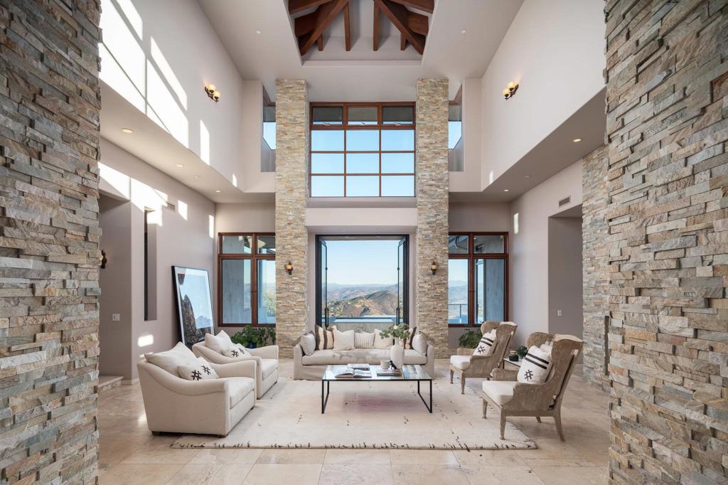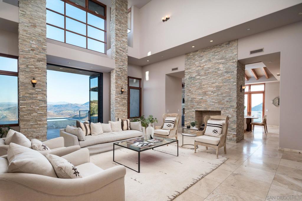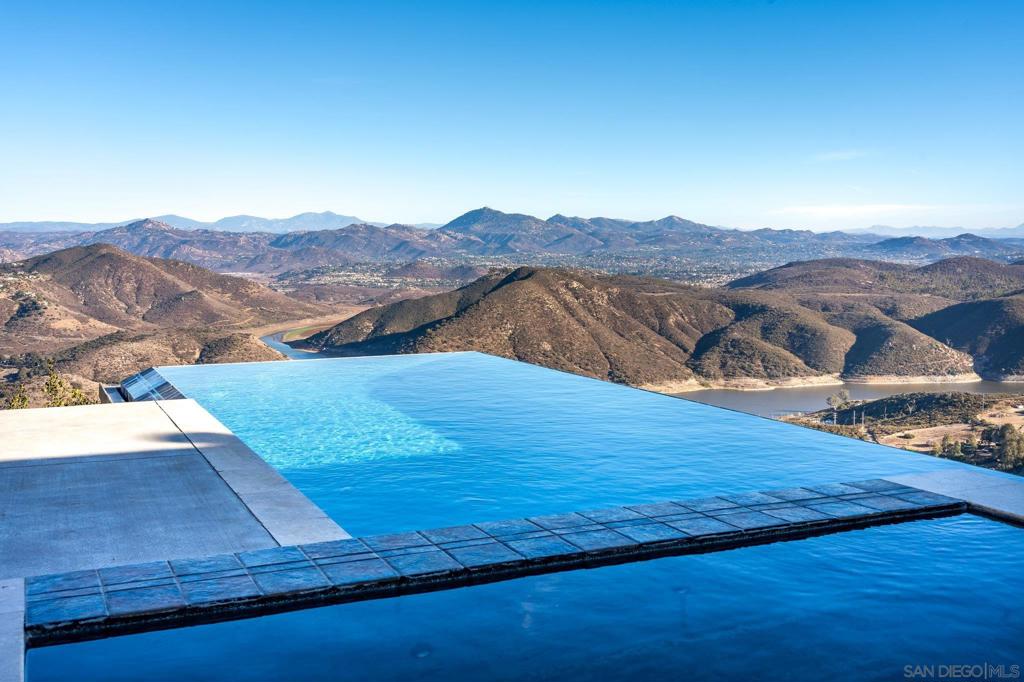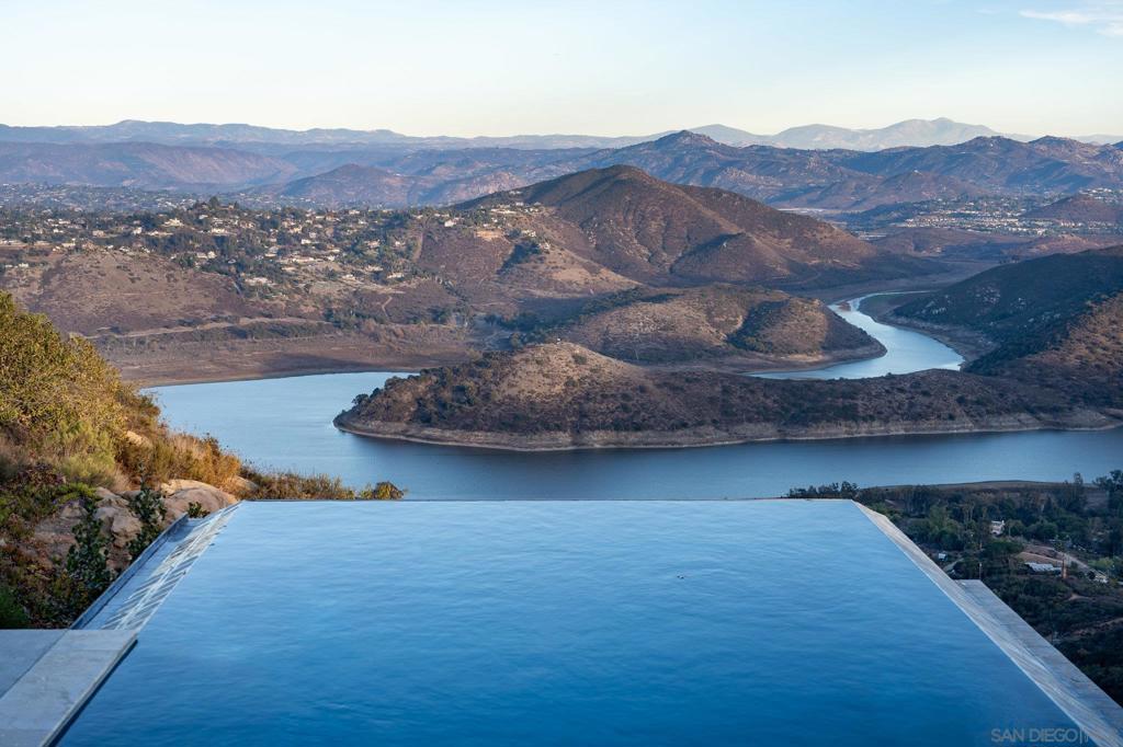 With panoramic views of Lake Hodges, the surrounding mountains, and the ocean beyond, this stunning contemporary architectural masterpiece is truly one-of-a-kind. Designed by renowned architect Jorge Engle, the home features soaring beamed ceilings, exquisite stone accents, and breathtaking vistas from every room, seamlessly blending modern design with its natural surroundings. The main level includes an expansive master suite, a formal office, and a wraparound deck with an infinity-edge pool and spa, all crafted to showcase the spectacular views. An elevator leads to the lower level, offering three spacious bonus rooms ideal for creating a private suite, complete with a game room and a tiered theater room. This exceptional home also boasts paid solar, a large workshop, a 3-car garage, and an oversized driveway. Contemporary luxury meets timeless elegance in this rare opportunity to own a true architectural gem.