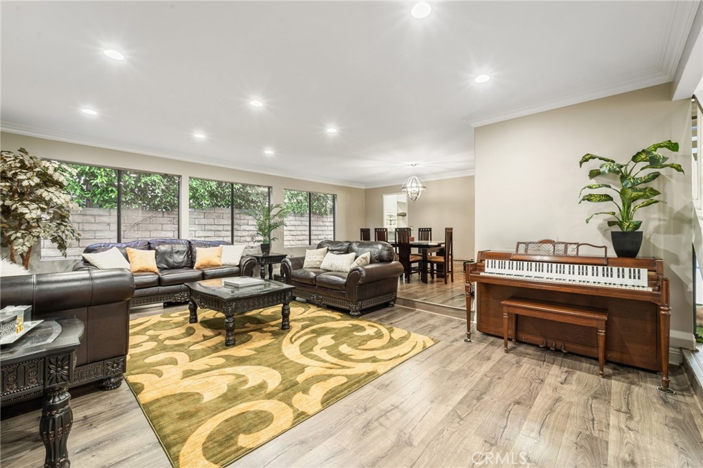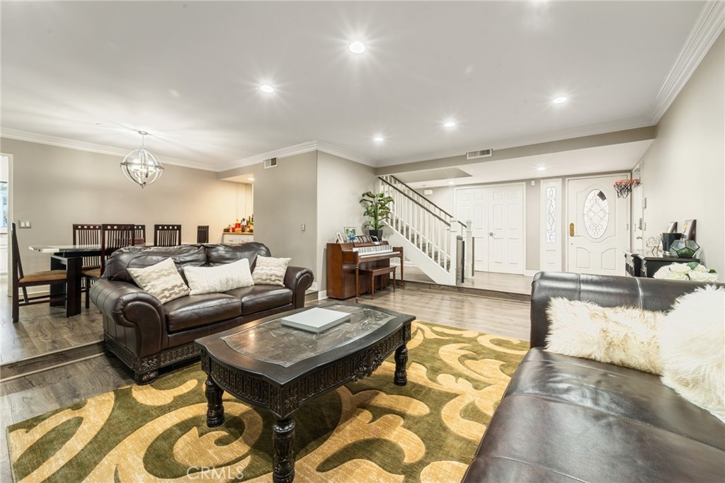 Situated on a quiet cul-de-sac in a desirable Winnetka neighborhood, this expansive two-story residence offers approximately 2,976 square feet of thoughtfully designed living space with 5 bedrooms and 4 bathrooms, ideal for growing families or multigenerational living. A welcoming double-door entry opens to bright, oversized living areas enhanced by recessed lighting, crown molding, and wide-plank wood-style flooring throughout. The formal living and dining areas flow seamlessly together, creating an ideal setting for gatherings and entertaining. The spacious kitchen is appointed with granite countertops, abundant cabinetry, stainless steel appliances, and an extended counter with bar seating overlooking the backyard. Large picture windows fill the space with natural light and offer views of the outdoor entertaining areas. A generously sized family room with a fireplace provides additional space to relax or host, while a downstairs bedroom with an adjacent bath offers flexibility for guests, in-laws, or a private home office. Upstairs, the expansive primary suite features ample closet space and a large ensuite bath with soaking tub, separate shower, and dual vanities. Additional bedrooms are well-proportioned, offering comfort and versatility. The backyard is designed for year-round enjoyment, featuring artificial turf, mature landscaping, a covered patio with string lighting, basketball hoop, and multiple areas for recreation and entertaining. Solar panels provide added efficiency and long-term savings. Ideally located near Westfield Topanga & The Village, Warner Center, Costco, Pierce College, and local parks, with convenient access to the 101 and 118 freeways, this home offers both space and connectivity in the heart of the West Valley. With nearly 3,000 square feet of living space and a prime cul-de-sac setting, 7,675 sqft expansive lot, this Winnetka residence delivers comfort, functionality, and lifestyle in one complete package.